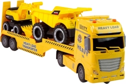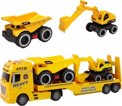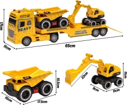 Открийте големия строителен сет, който ще зарадва всички малки почитатели на работните машини. Автовозът с подвижна товарна рампа лесно товари и разтоварва включените машини. Реалистичните мигащи маяци и звуци на двигател, клаксон и сирена, активирани с бутони, добавят автентичност на играта. Багерът има ръчно управлявано рамо с кофа, а самосвалът е оборудван с повдигаща се каросерия за „разтоварване на материал“.