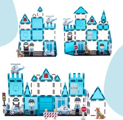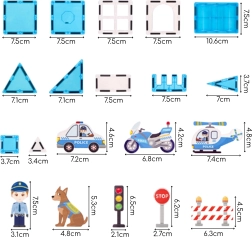 - Магнитни панели с различни форми, фигурки на полицаи, полицейско куче, патрулна кола, хеликоптер, мотоциклет, пътни знаци, бариери, стикери