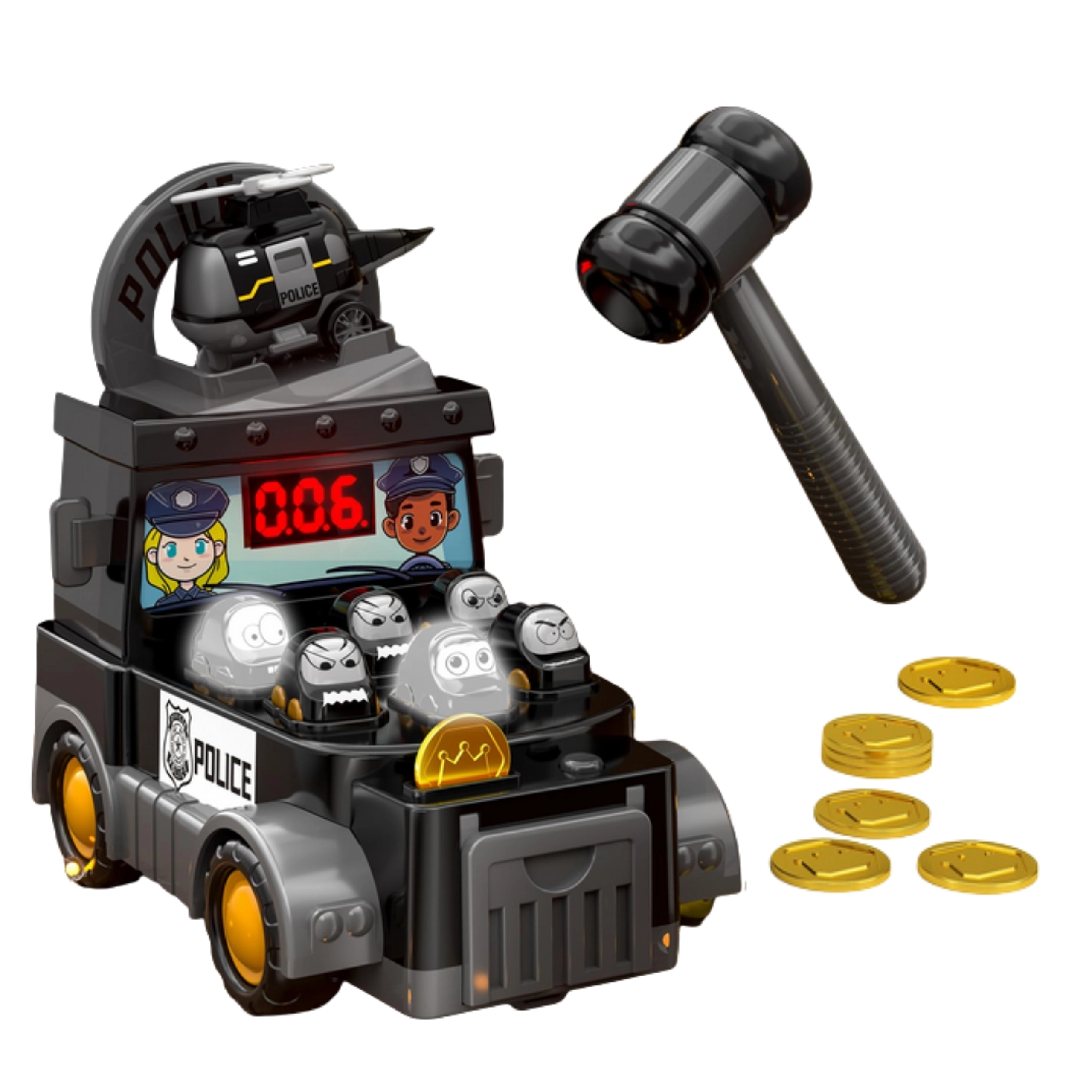 Полицейската версия на популярната игра Удари къртицата ще зарадва деца от 3 години. Достатъчно е да вземете мекото чукче и да улучвате „злодеите“, които изскачат от отворите в радиовата кола. Благодарение на дисплея с резултат децата лесно следят представянето си и могат да се състезават с приятели или родители.