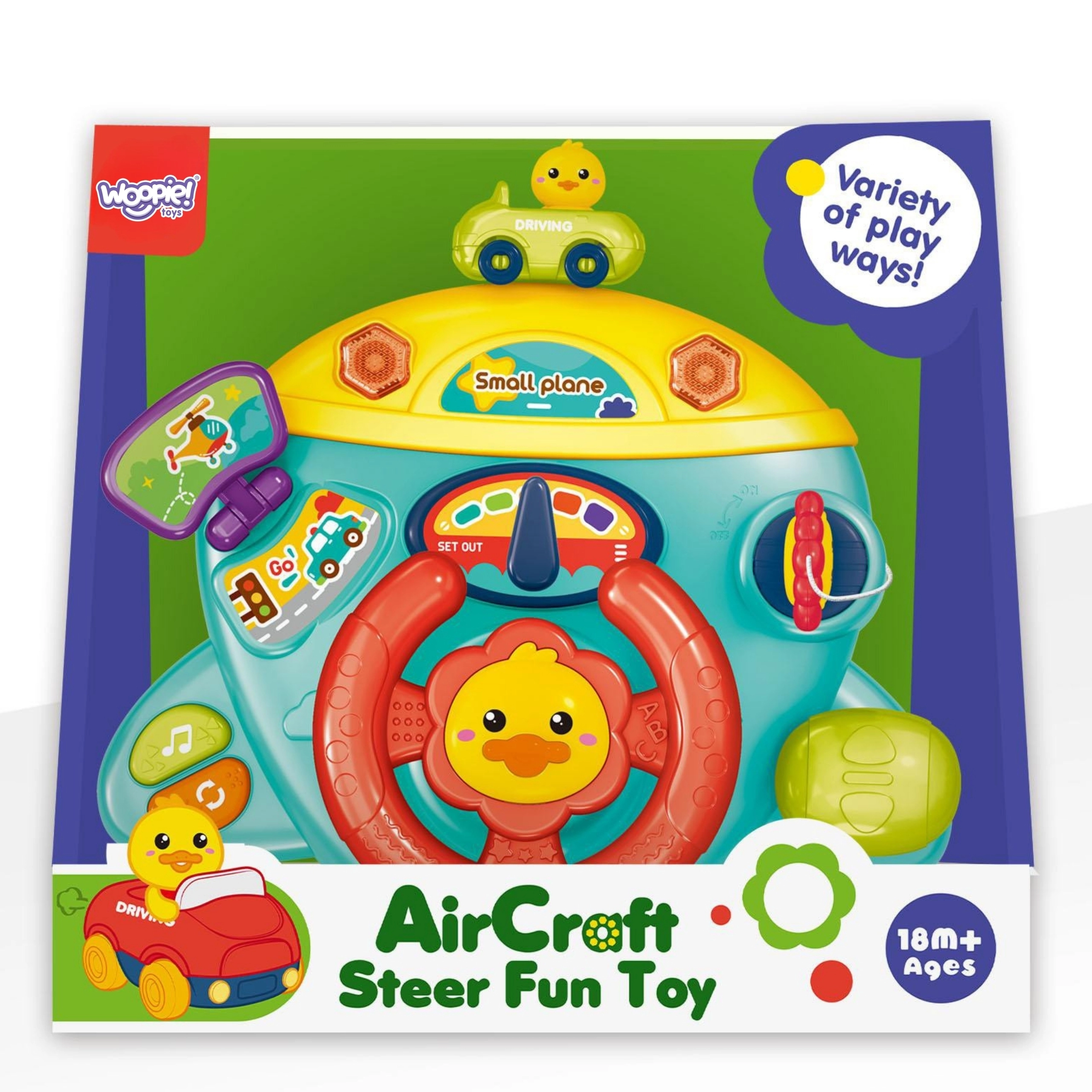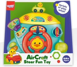 Забавна интерактивна играчка във формата на самолет превръща всяка разходка и момент в леглото в приключение. Благодарение на воланчето, светлините и звуците детето се забавлява като пилот и едновременно развива уменията си. Лесното закрепване с помощта на ленти с велкро осигурява безопасна употреба у дома и по време на път. Светлинни и музикални ефекти, подвижни елементи и волан във формата на патенце подпомагат координацията ръка–око и въображението.