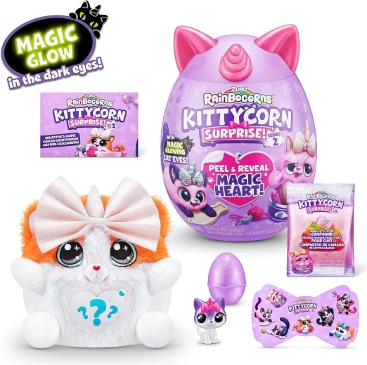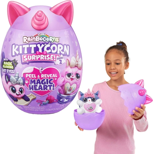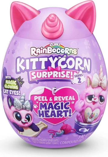 Открийте магическия свят на RAINBOCORNS KITTYCORN SURPRISE – меко плюшено котенце с еднорогов рог и тайни аксесоари, скрити в яйце. Всяка опаковка носи радост от разопаковането, разменяне на аксесоари и креативна игра. Страхотен подарък за деца от 3 години и колекционерска серия от 7 различни любимеца.