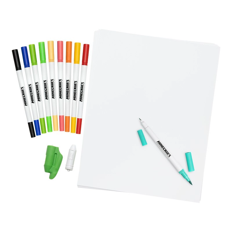 Комплектът включва леки двустранни маркери с фин и по-широк връх за прецизни линии и плавно засенчване. Идеални за скици, прерисуване и оцветяване на мотиви от Minecraft.
