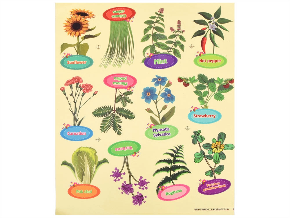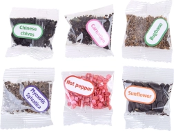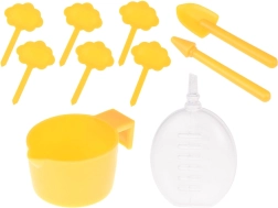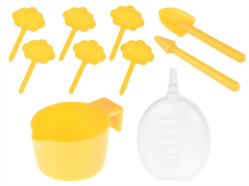 - 1× мини оранжерия, 6× биоразградима саксийка, 6× кокосов брикет (Ø 30 mm), 6× етикет за обозначаване на растения, 1× лопатка, 1× сеитбена шпица, 1× чашка за поливане, 1× комплект стикери (с имена и картинки на растения), 1× комплект стикери с имена на растения (на английски), 6× плик със семена (нетребка, слънчоглед, многогодишно цвете, див лук/шнит-лук, карамфил, чушка/пипер), илюстрирано ръководство