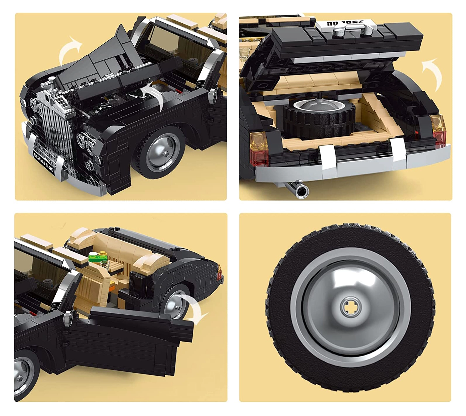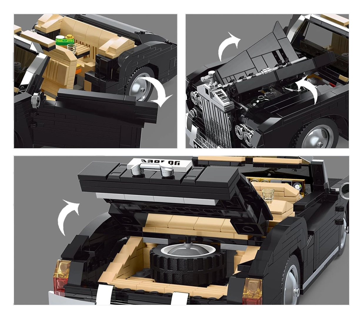 Отваряеми врати, преден капак и багажник, въртящи се колела и детайлен интериор с волан и табло.