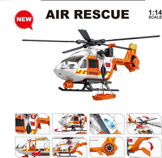 Децата ще оценят отварящите се странични врати и задна клапа, подвижната кука с транспортен кош и сгъваемите и въртящи се ротори. LED осветлението отпред, отгоре и в кокпита заедно с автентичните звуци на полет и аларма подсилват атмосферата на спасителните акции. Хеликоптерът се захранва от 2× AAA батерии (включени в комплекта).