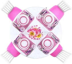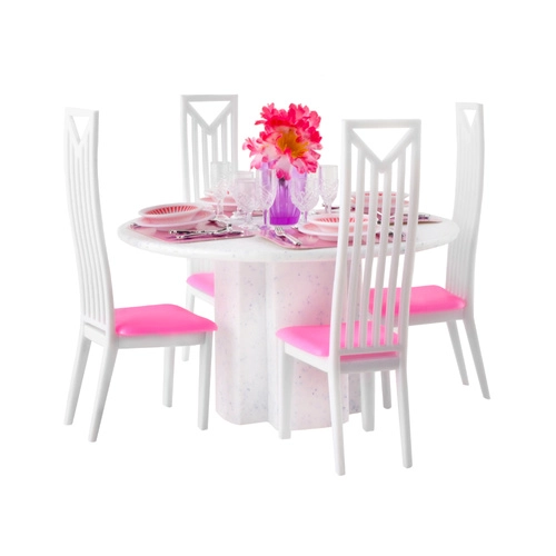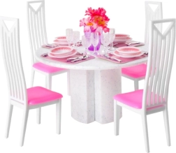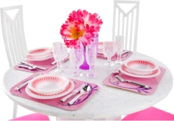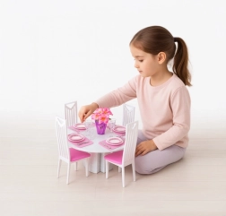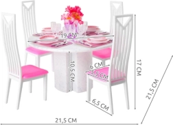Кръгла маса, четири стола и пълен комплект съдове и прибори. Всичко е съчетано в розово‑бяло за реалистично хранене и красива презентация.