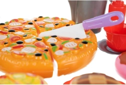 Сегментите на пицата са свързани със сух цип – децата могат да ги разделят с пластмасов нож и да ги съединят отново. Реалистична игра без бъркотия, която подпомага фината моторика.