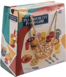 - Пица, нож за пица, нож, 2× хотдог, хамбургер (питка, салата, котлет), пържени картофи, кетчуп, чашка със сламка, кана, 2× чаша с чинийка, десерти (пясъчна форма, поничка, кифла, 3× бисквита), прибори (лъжица, нож, вилица), съдове, инструкция