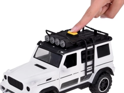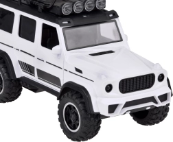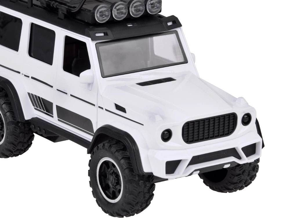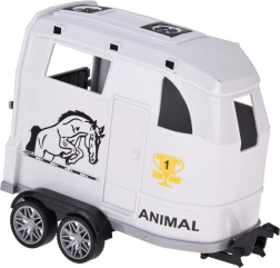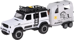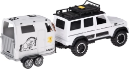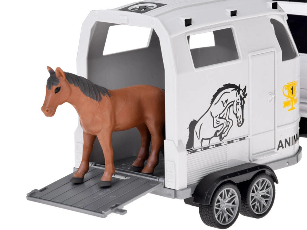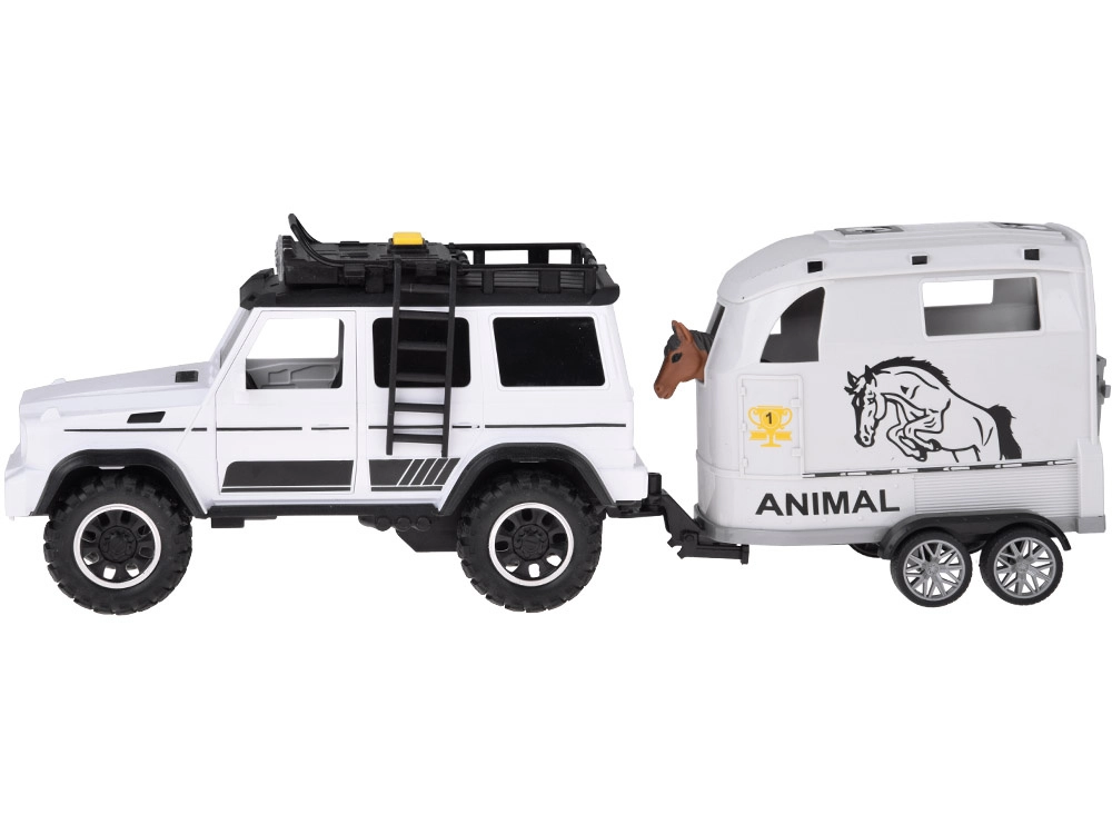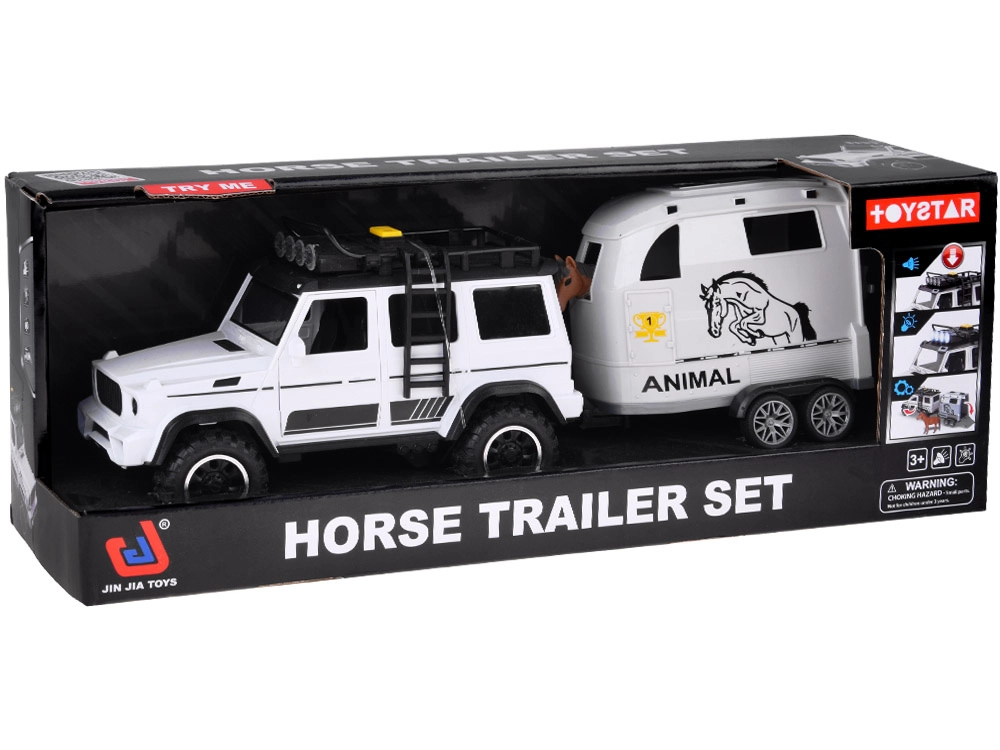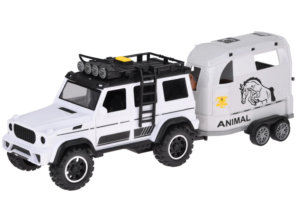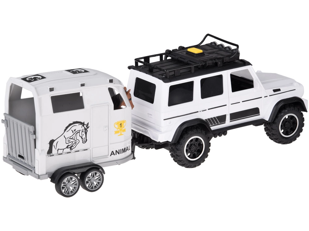 Открийте забавен комплект за малки почитатели на колите и животните: бял офроуд автомобил с подвижно ремарке за коне и фигурка на кон. Превозното средство има отварящи се врати, гумени колела, светлинни и звукови ефекти и теглич. Ремаркето предлага скапаща се задна рампа и плавно търкалящи се колела за реалистична игра.