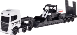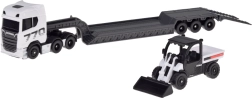 Открийте реалистичната композиция SCANIA 770S с нисколеглово полуремарке и функционален товарач, която впечатлява с вярна изработка на детайлите и атрактивна бяло-сивa комбинация. Металното шаси на кабината и качествените пластмасови елементи на подвозката осигуряват издръжливост дори при честа игра.