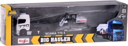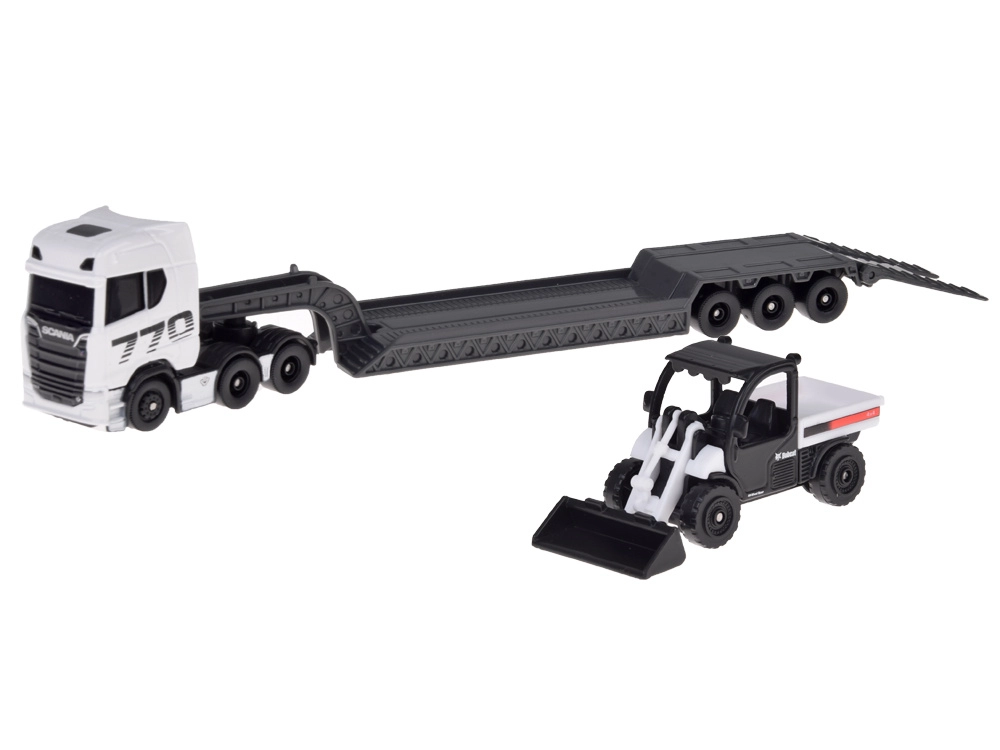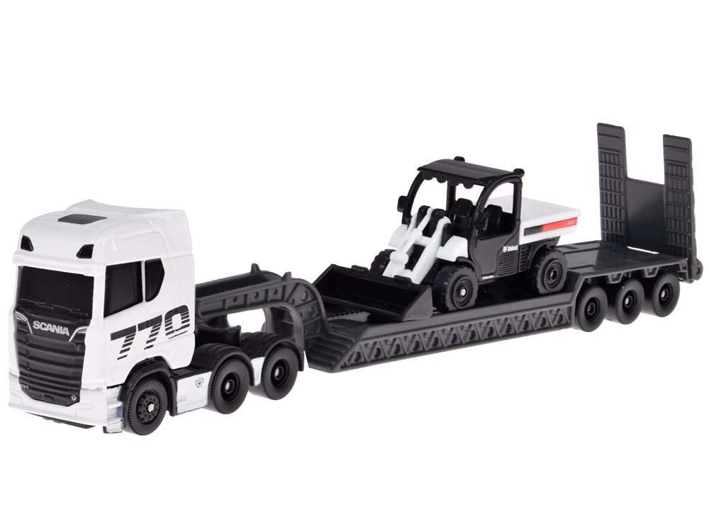 Лицензиран модел в мащаб 1:64 представя SCANIA 770S с нисколеглово полуремарке и компактен товарач. Благодарение на металната каросерия, прецизните детайли и отделящата се композиция е идеален както за колекционери, така и за творческа детска игра.