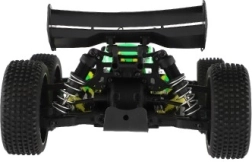 Радиосистемата 2,4 GHz с обхват до 100 м предлага плавно, безсмутно управление, а напълно функционалното окачване с масивни амортисьорни щоки и възможност за прогресивна настройка се адаптира към повечето терени. Включени са две батерии 7,4 V 850 mAh (15C) за по-дълго каране и USB зареждане; контролерът изисква 4× AA (не са включени).