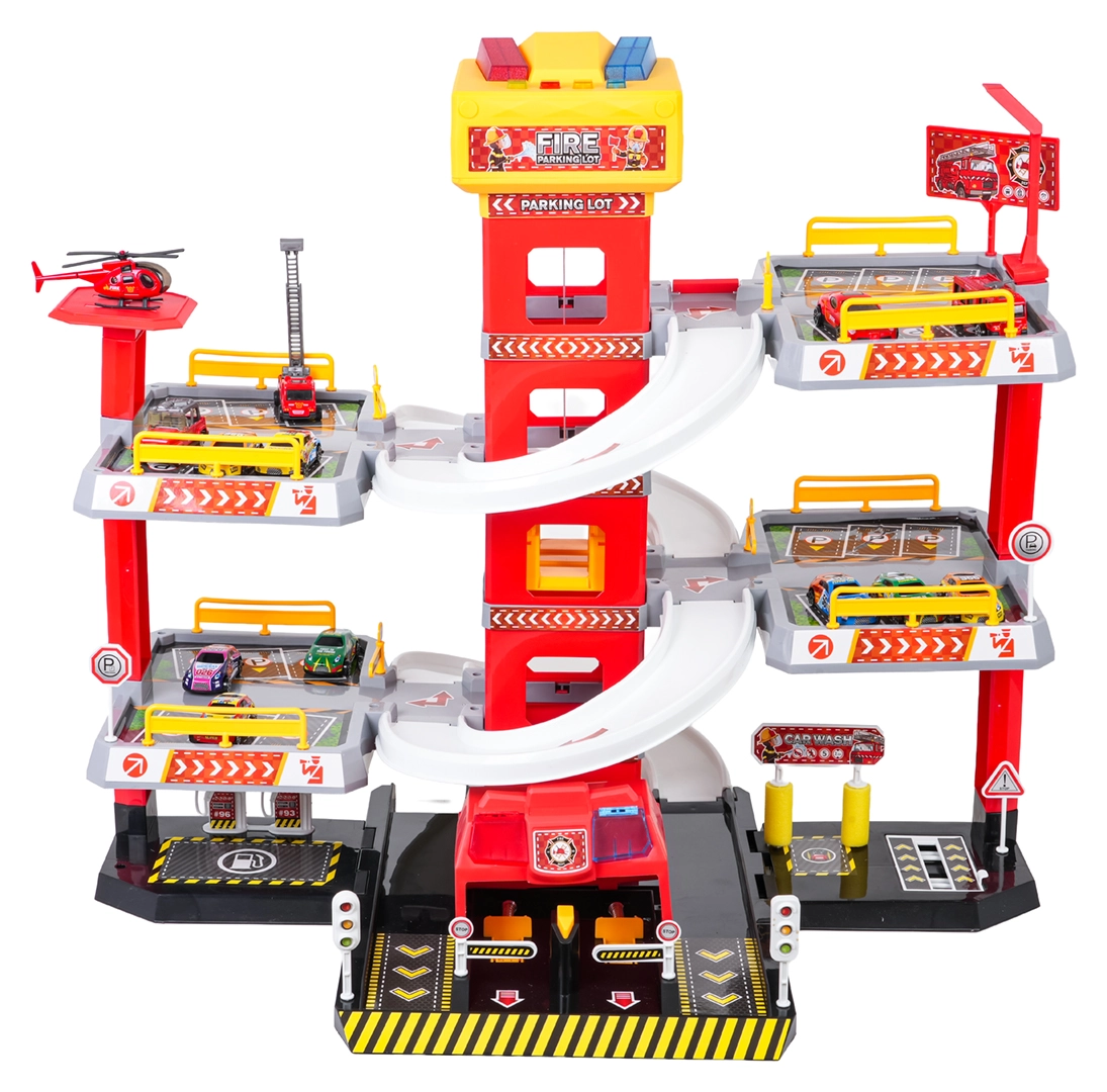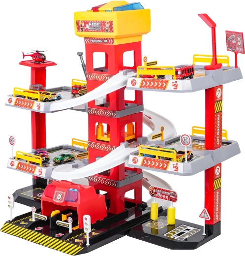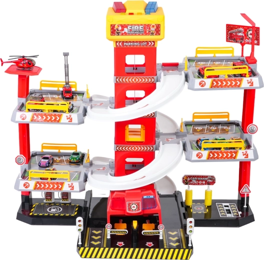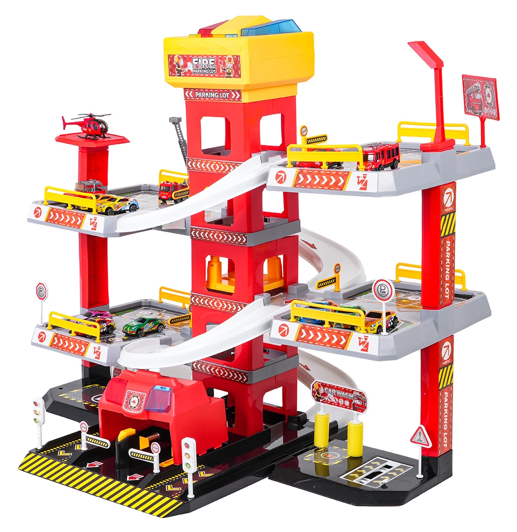 Този голям, 3-етажен пожарникарски паркинг предлага на децата реалистична и динамична игра. Благодарение на централната кула с асансьор количките могат удобно да се придвижват между етажите или да се спускат стремглаво по извитите рампи. Горният панел на асансьора е оборудван с големи бутони за управление нагоре/надолу и четири по-малки бутона за ефекти – звук на потегляне, заден ход, ускорение, спиране и мелодия, допълнени от мигащи светлинки.