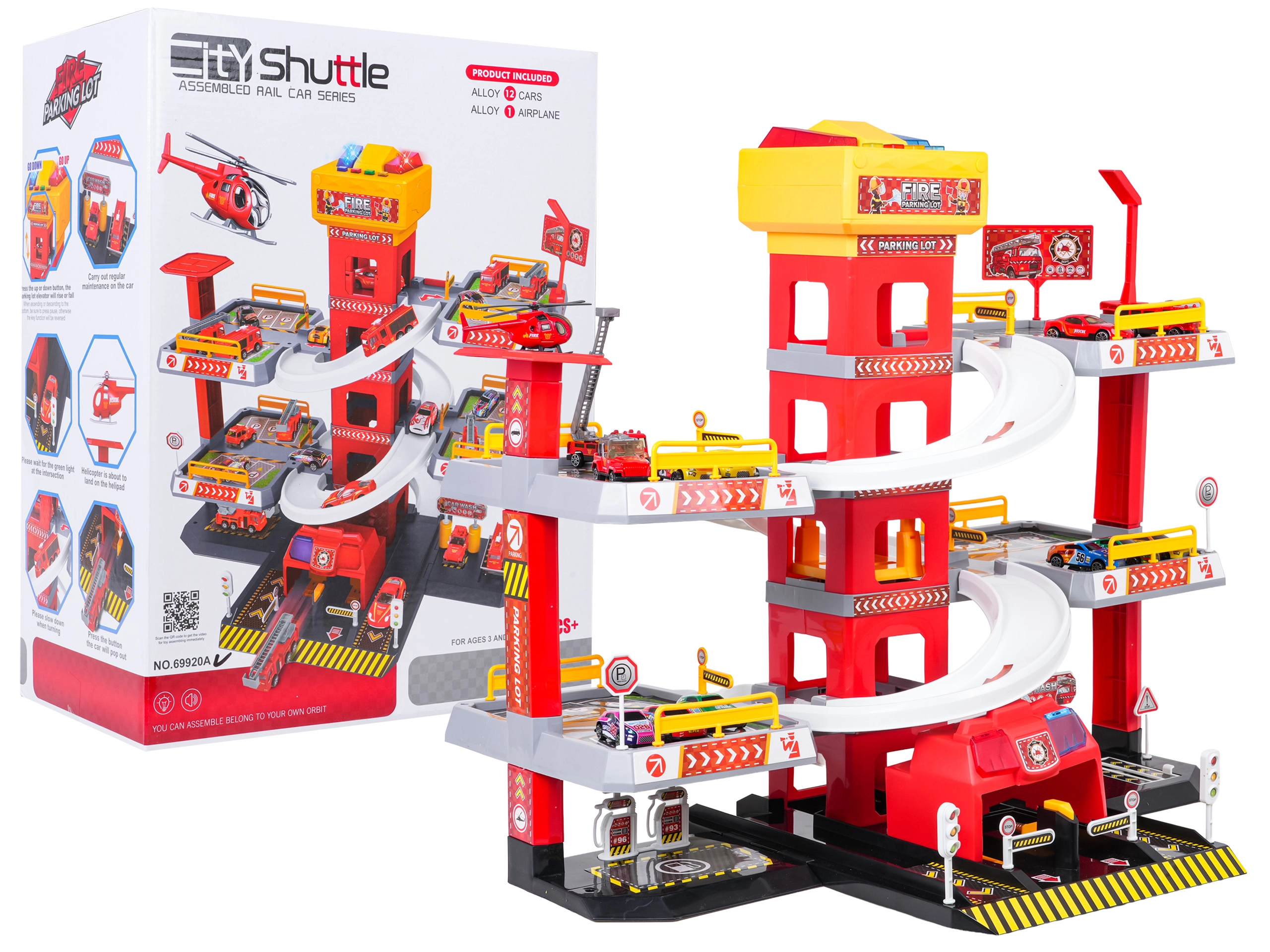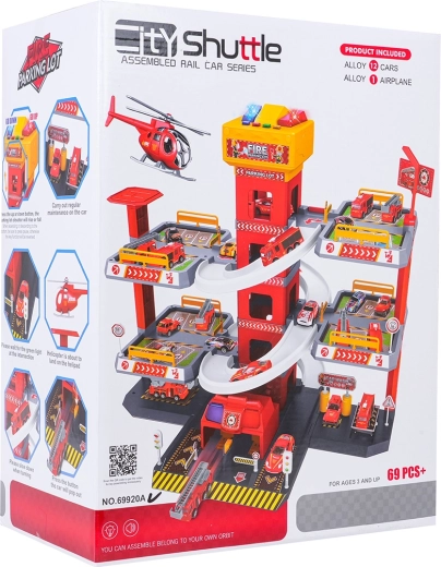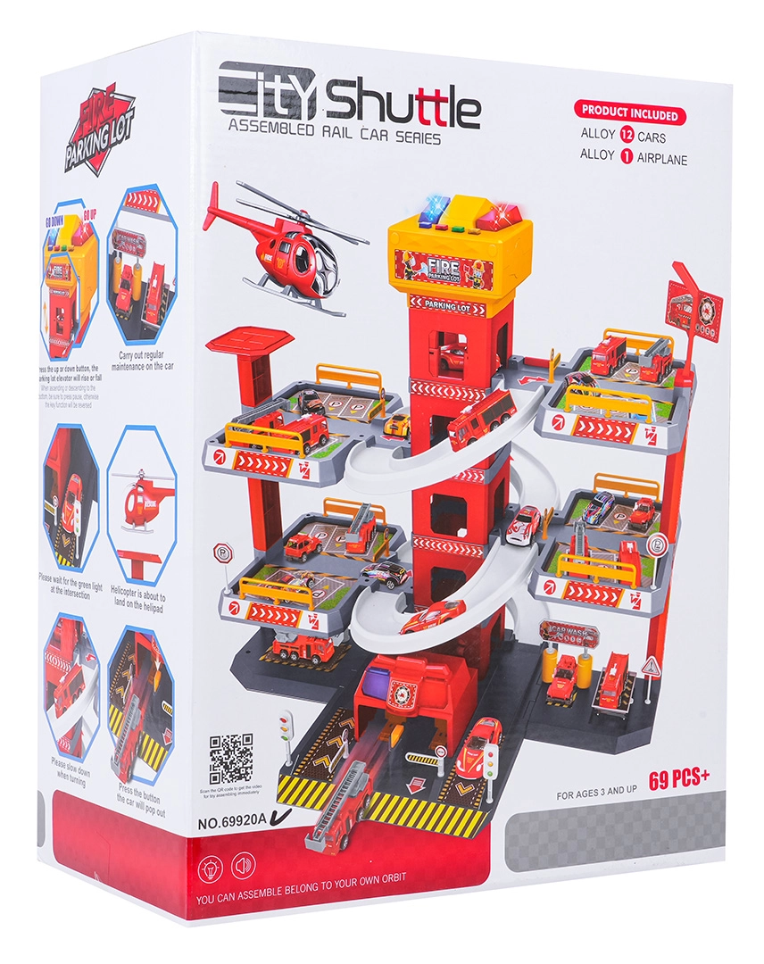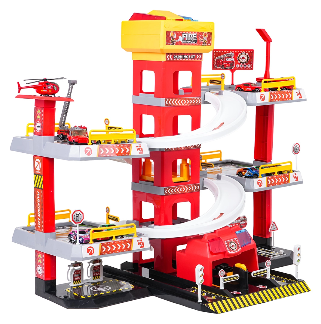 Този голям, 3-етажен пожарникарски паркинг предлага на децата реалистична и динамична игра. Благодарение на централната кула с асансьор количките могат удобно да се придвижват между етажите или да се спускат стремглаво по извитите рампи. Горният панел на асансьора е оборудван с големи бутони за управление нагоре/надолу и четири по-малки бутона за ефекти – звук на потегляне, заден ход, ускорение, спиране и мелодия, допълнени от мигащи светлинки.