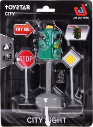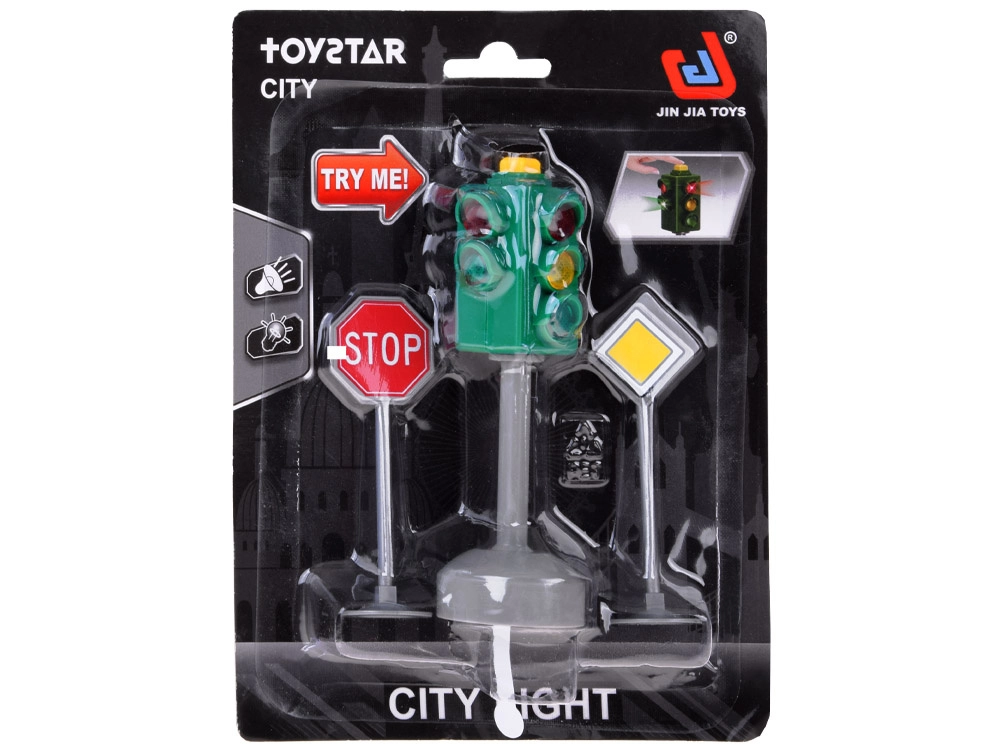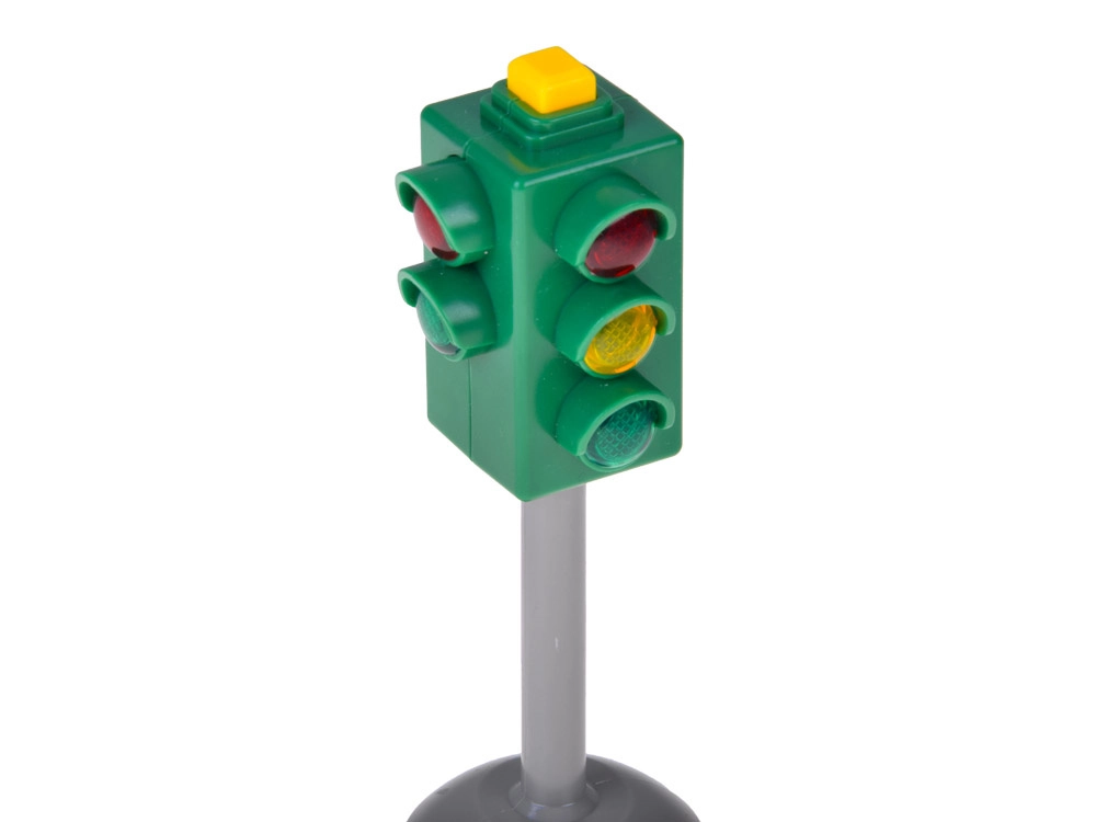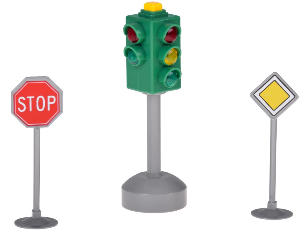 Този реалистичен светофарен комплект внася ред и забавление в детската игра. Светофарът има червена, жълта и зелена светлина и съпътстващи звукови ефекти, благодарение на които децата разбират кога е време да спрат, изчакат и тръгнат. В комплекта са включени и 2 пътни знака – STOP и Пропусни движещите се по основния път, които обогатяват игровите сценарии и подпомагат безопасните навици.