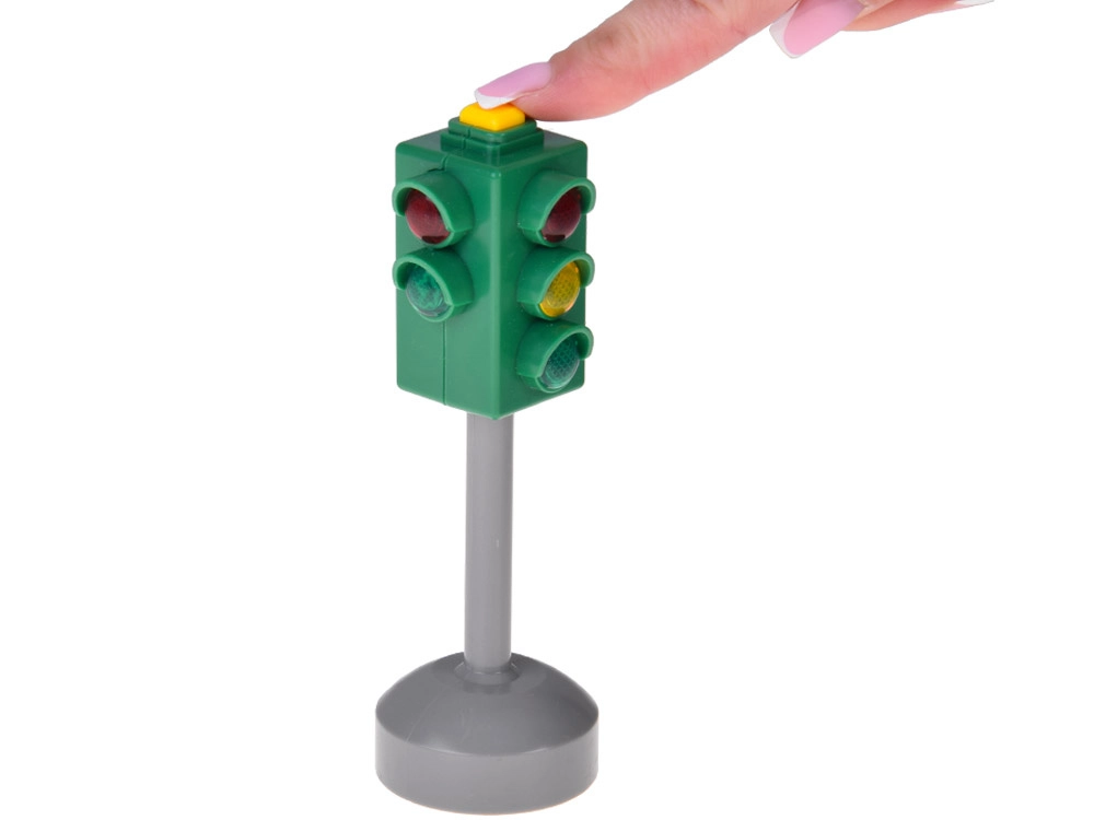Горният бутон служи за активиране на светлините и звука. Децата сами управляват смяната на сигналите и тренират пътни ситуации.