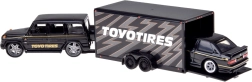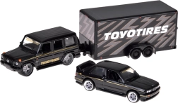 Открийте непреходния дуо сет, който ще зарадва колекционери и почитатели на автомобилите: здрав MERCEDES‑BENZ G (1988) и легендарно BMW M3 E30 в унифицирана черна цветова схема. Метален корпус с прецизни линии, гумирани колела и чисти печати на детайлите придават автентичен вид. Функционалното ремарке с товарна рампа позволява безопасно „превозване“ на BMW зад MERCEDES, което повишава игровите възможности и атрактивността при изложение.