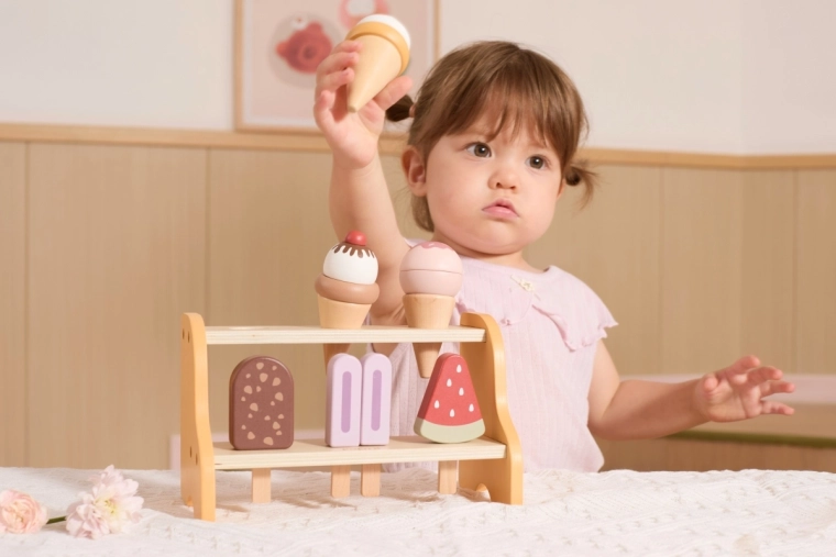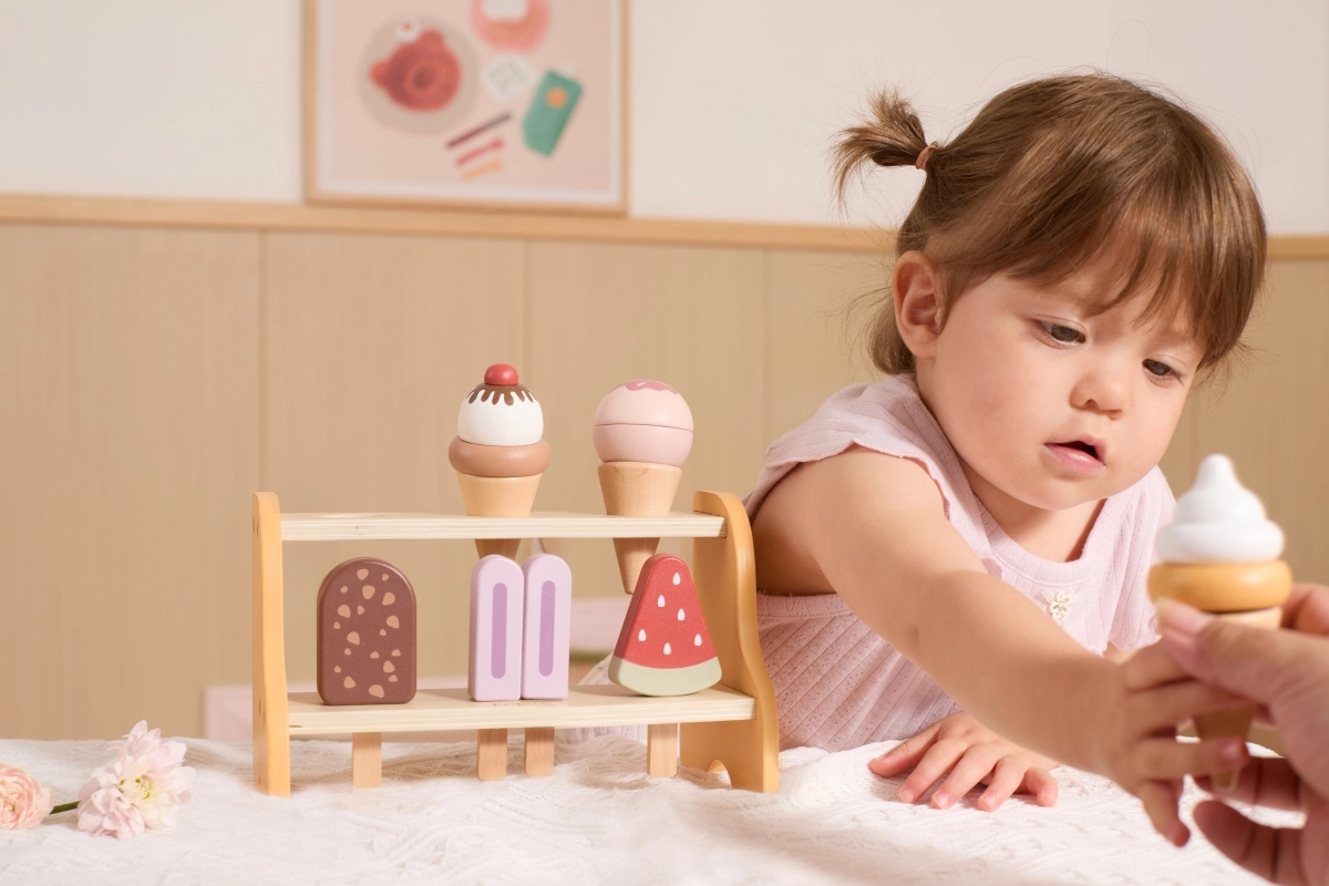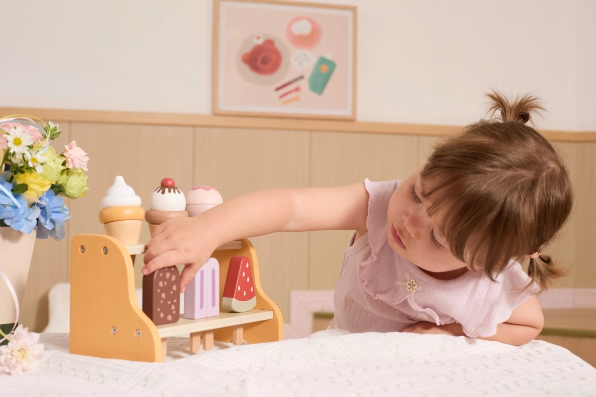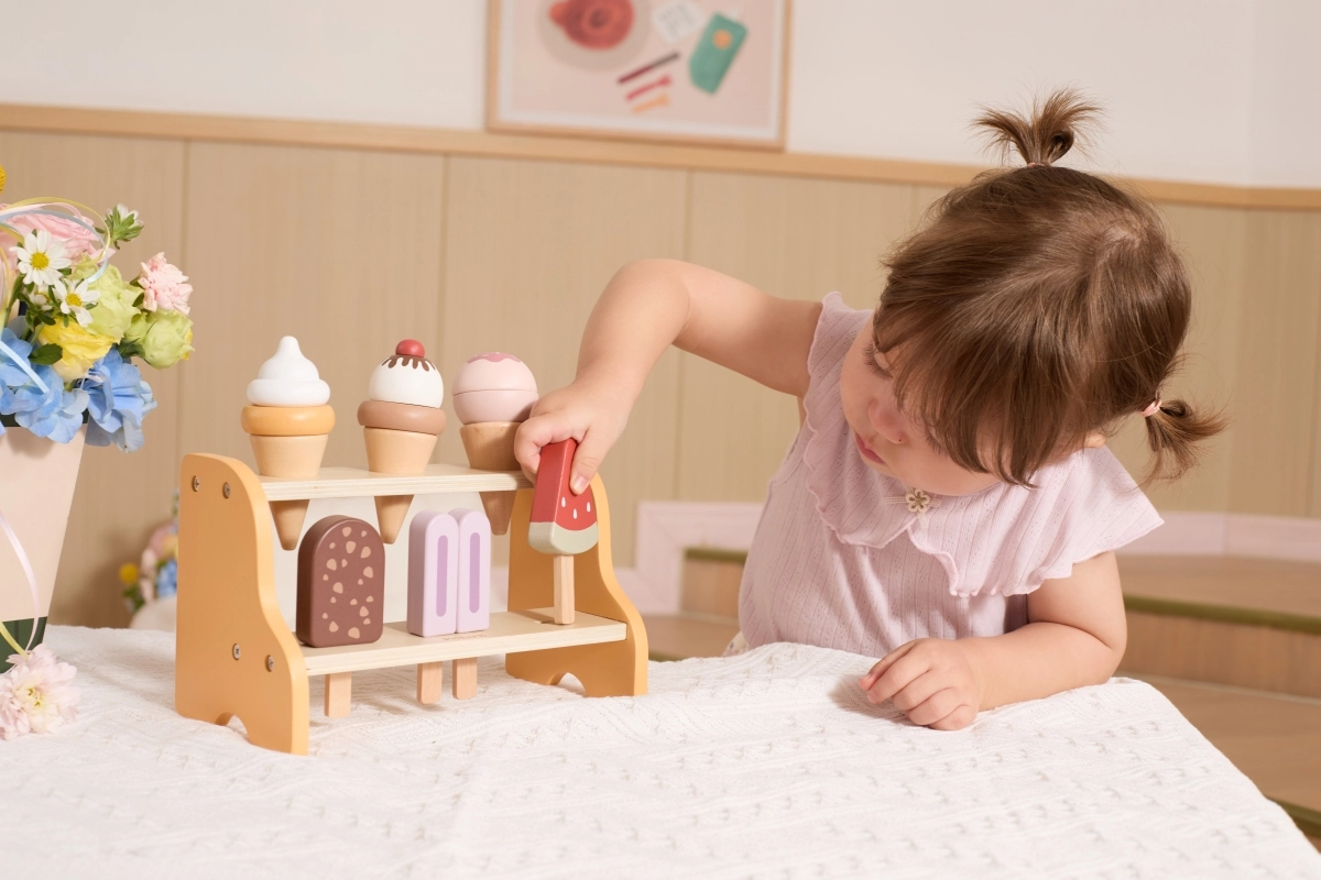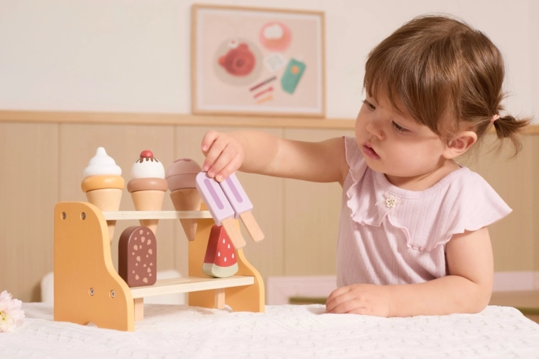 Играта на сладоледаджийница развива фината моторика, координацията ръка–око и социалните умения при съвместно продаване и пазаруване. Благодарение на подвижните части децата тренират хват, сортиране и ред, докато реалистичните форми и цветове стимулират въображението и креативността.