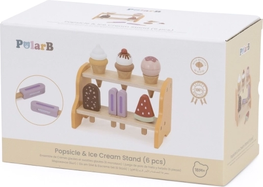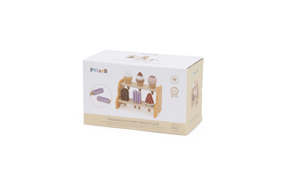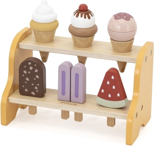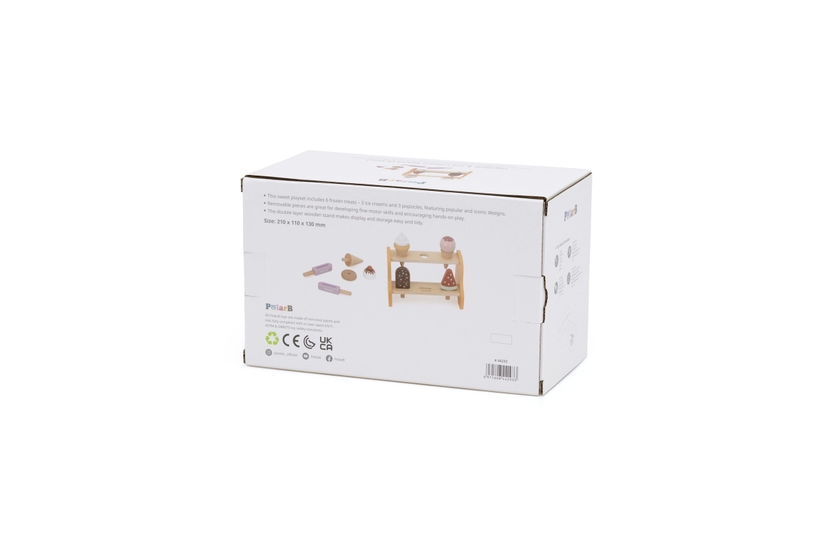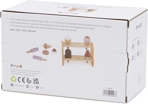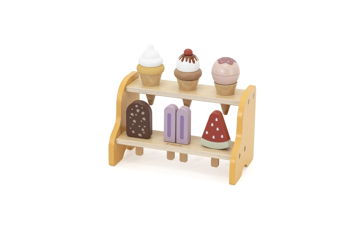 Практичната двуетажна поставка държи всички фунийки и сладоледи на мястото им. Децата естествено се учат да сортират, подреждат и представят „стоката“ като в истинска сладкарница за сладолед.
