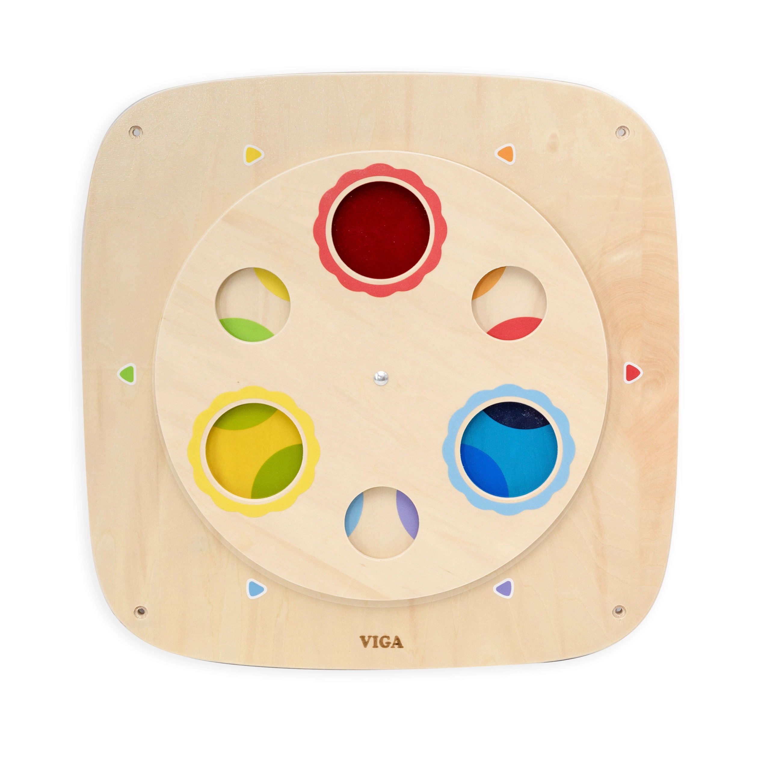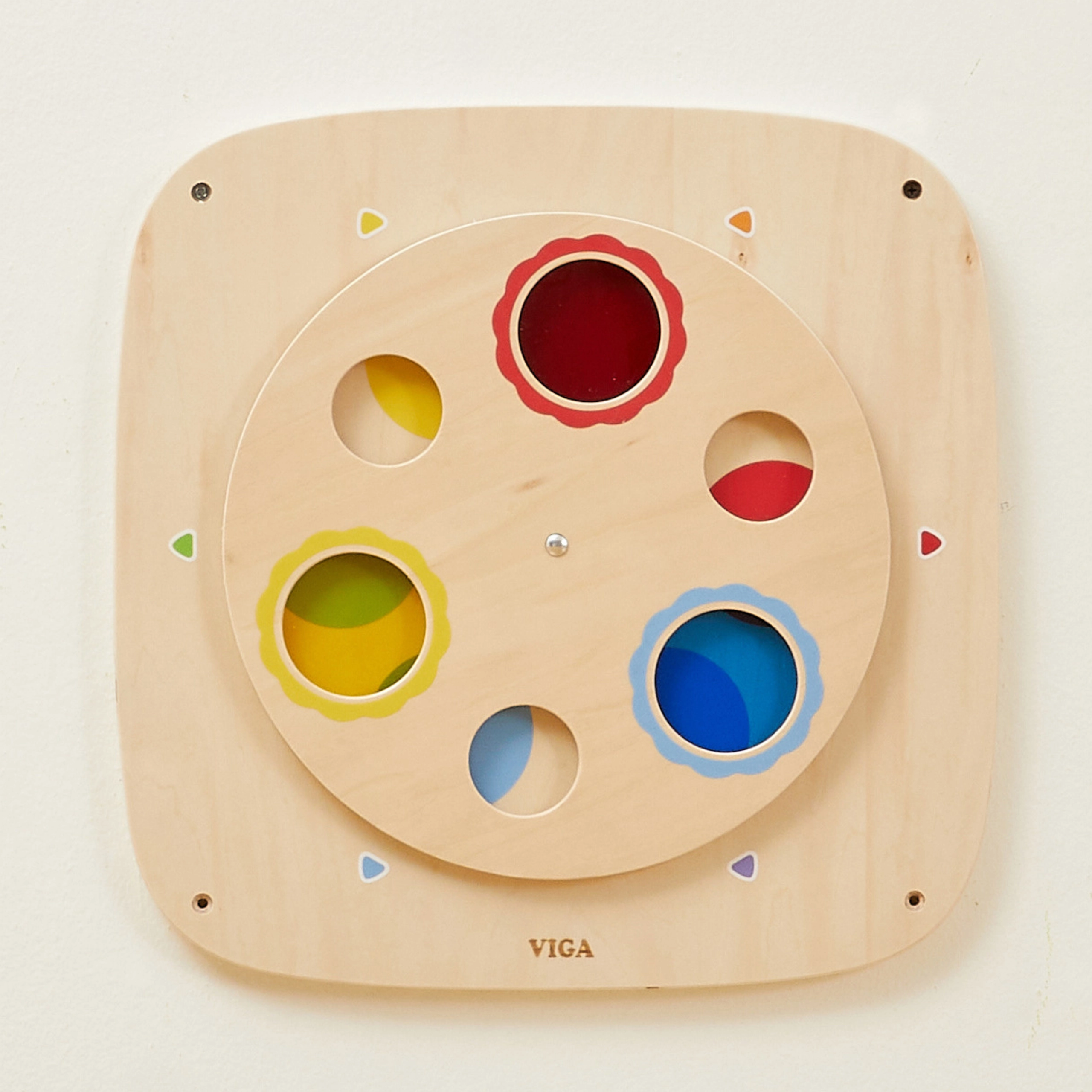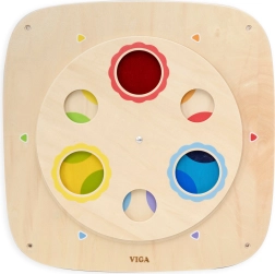 Тази висококачествена дървена стенна дъска VIGA представя по игрови начин теорията на цветовете. Въртящият се кръгъл панел с прозрачни цветни прозорчета позволява на децата да сравняват цветовете, да ги наслагват и да откриват нови нюанси. Благодарение на устойчивата изработка дъската е идеална за дома, детски градини и кътове за игра.