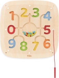 Тази дървена стенна дъска с числа 0–9 съчетава забавление и учене в едно. Децата, с помощта на приложения магнитен стилус, водят цветните топчета по обозначените пътеки, съотнасят ги към числата и така упражняват броене и координация око–ръка.