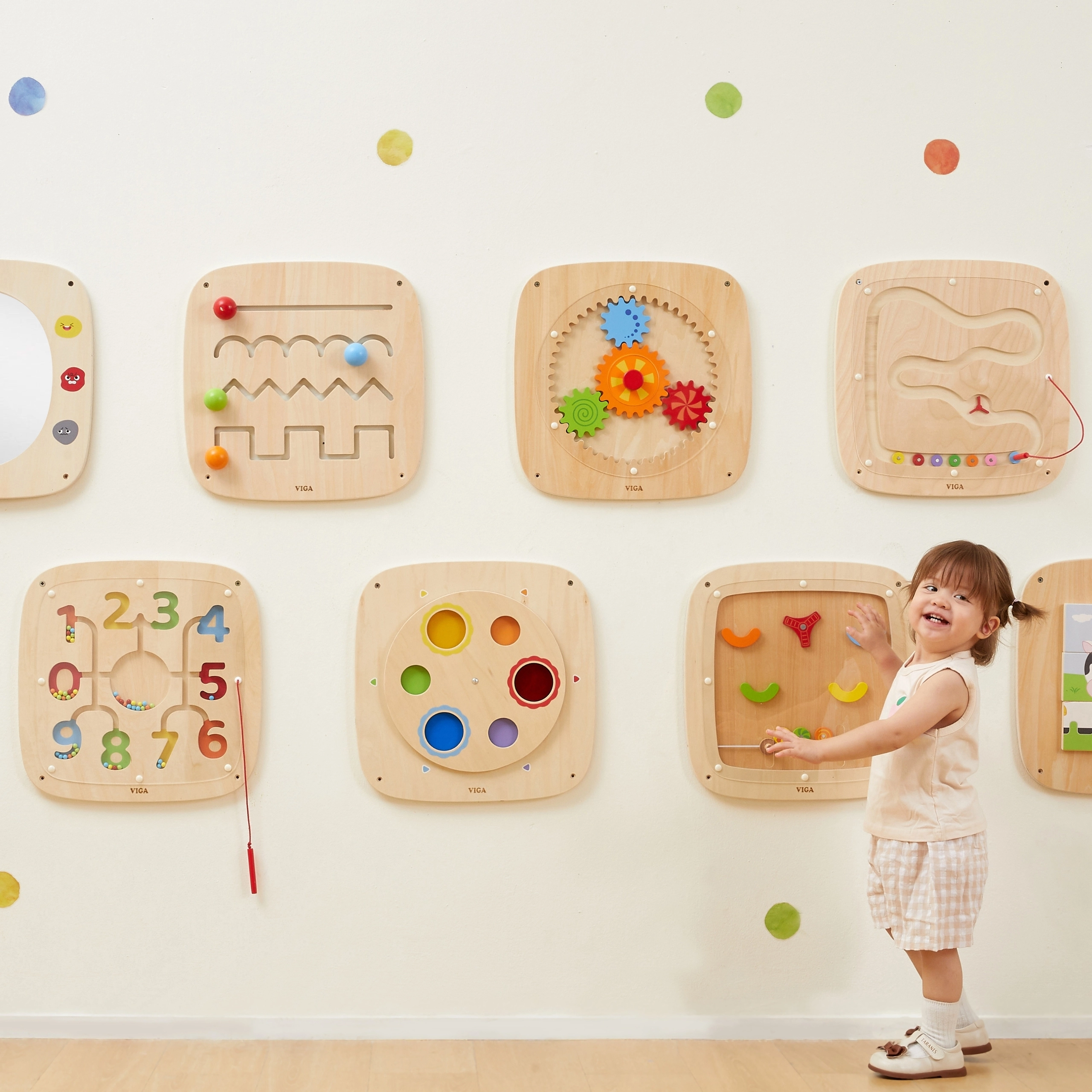 Издръжливата конструкция, гладката изработка и монтажът на стена осигуряват безопасно ползване и спестяване на място в игрална стая, детска градина или детска стая. Идеален помощник за предучилищна възраст от 2 години, който насърчава естественото любопитство и търпение.