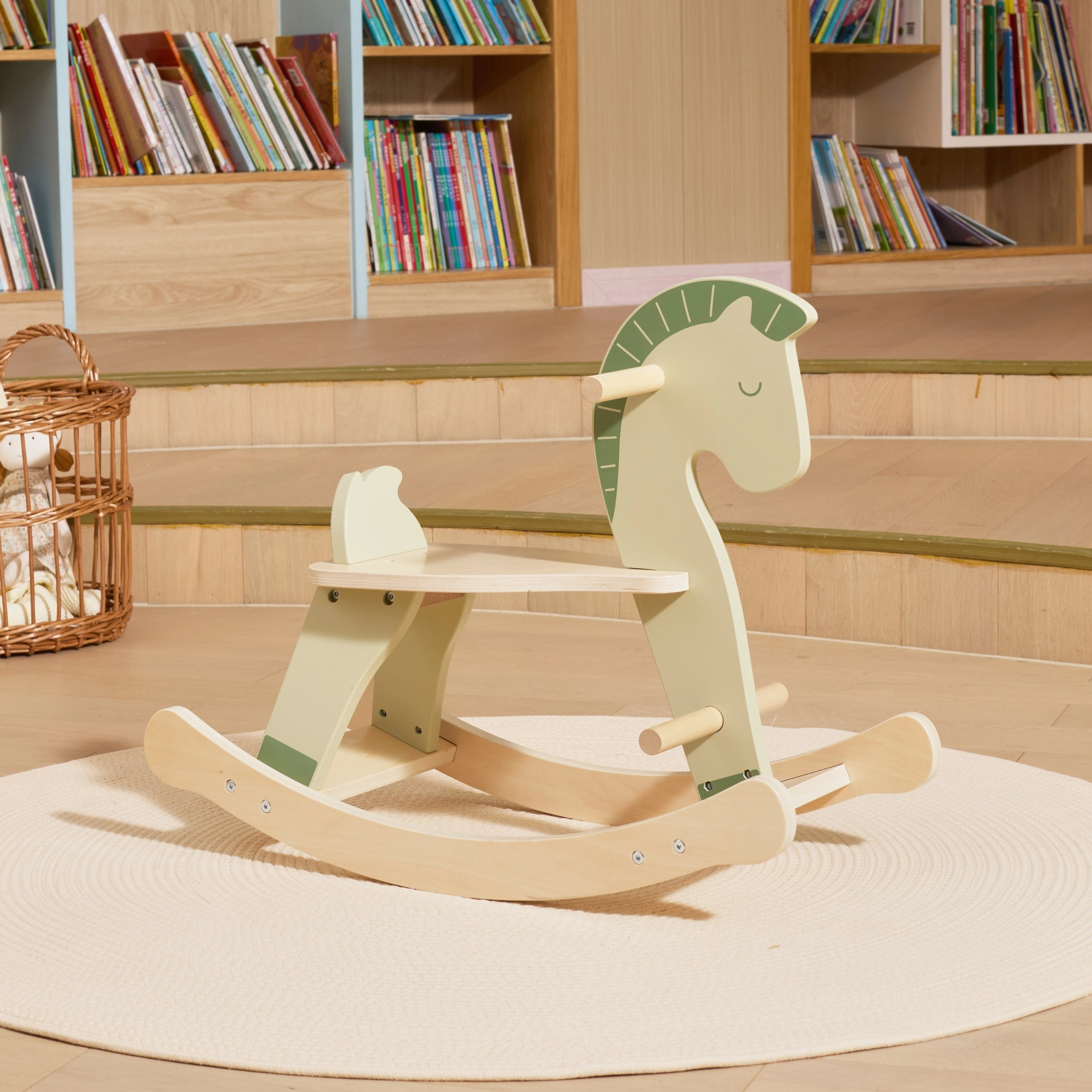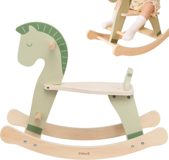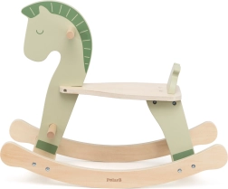 Това дървено люлеещо се конче в нежно пастелно зелено е чудесен спътник за първите домашни „разходки“. Подкрепя естественото развитие на равновесието, моториката и самоувереността на детето. Благодарение на здравите дръжки и стъпенки децата се чувстват уверени и защитени, докато гладко оформените шейни гарантират плавно и стабилно люлеене.