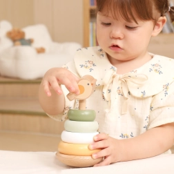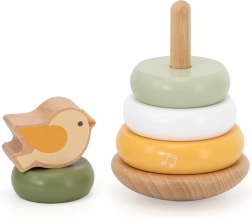 Дървената подреждаща кула с очарователна птичка на върха ще зарадва всяко мъниче. Цветните рингове с гладки ръбове се хващат лесно и се подреждат в различен ред, което подпомага различаването на цветове и размери и решаването на проблеми. Стабилната основа и приятно заоблените форми осигуряват безопасно боравене за малките ръчички.