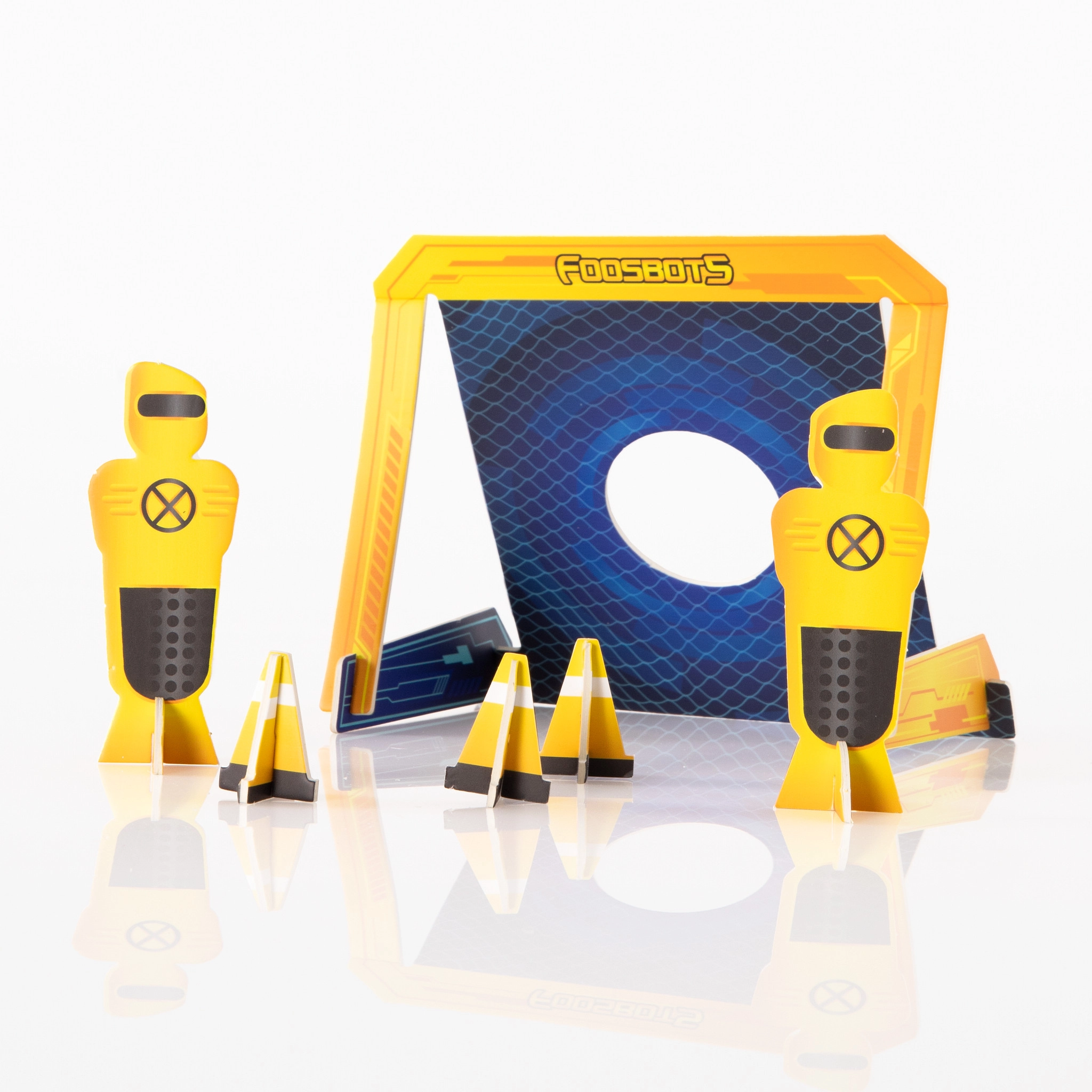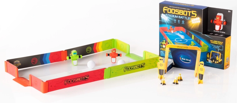 Foosbots стадионна битка внася в хола динамиката на настолния футбол в джобен формат. Благодарение на цветните бордове, вградените врати и двойката пръстови роботи лесно започвате дуел един срещу един. Управлявайте своите „ботове“ с ловки пръсти, изстреляйте бялата топка и пазете вратата в светкавично темпо.