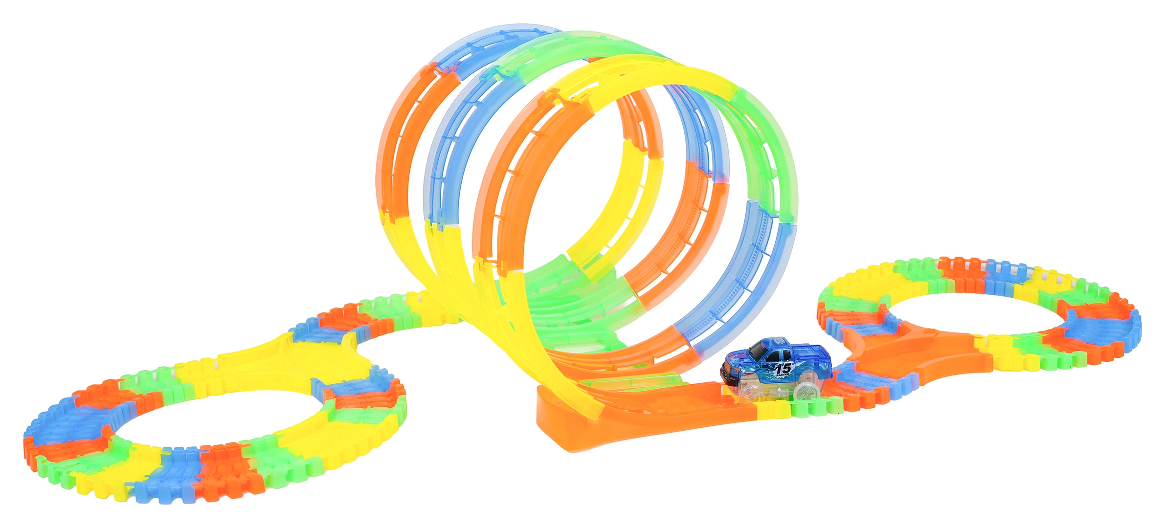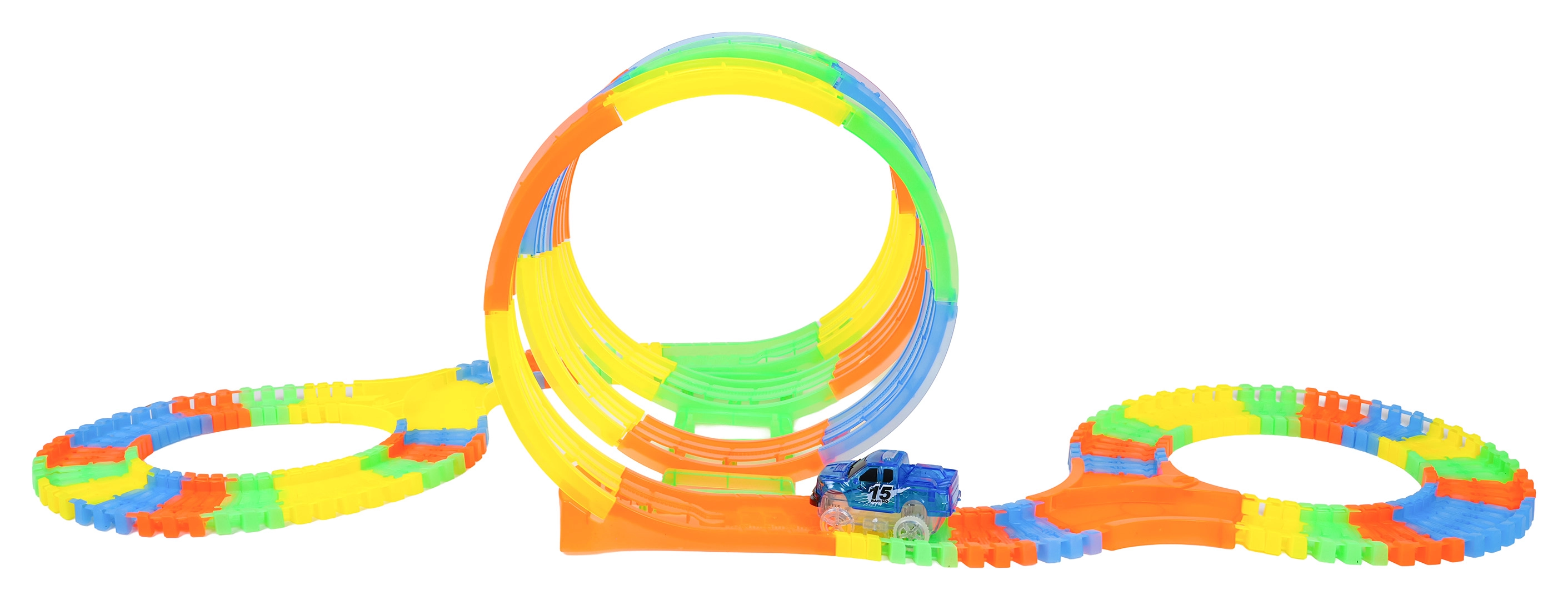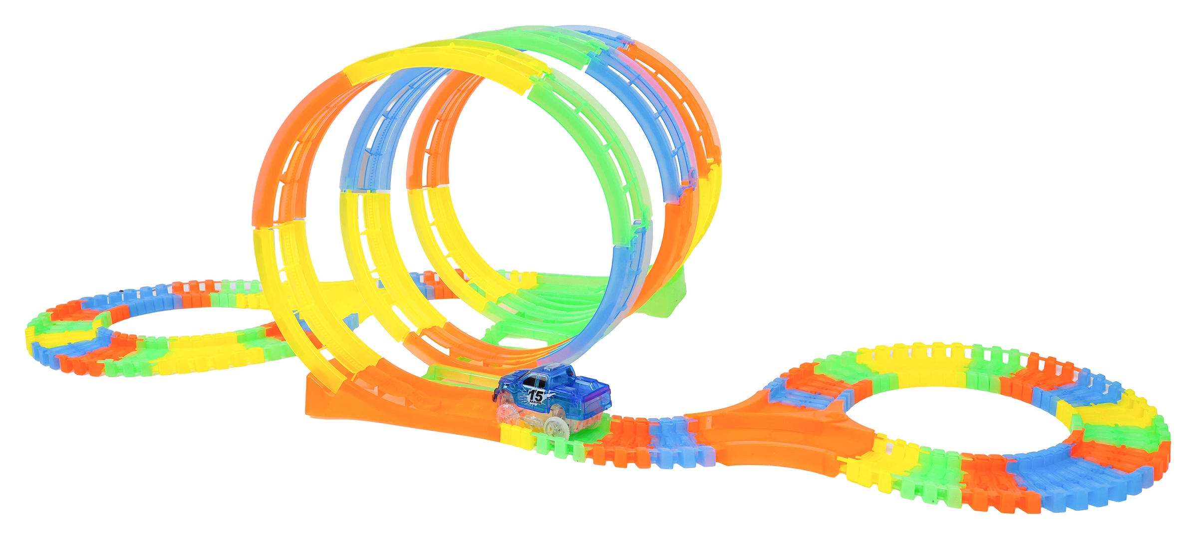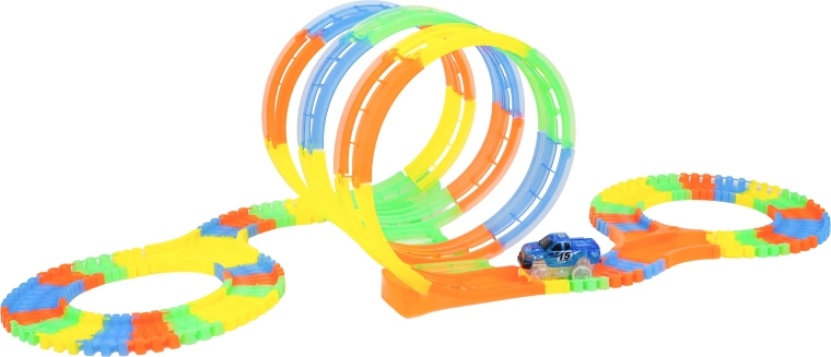 Тази цветна писта предлага на децата креативно строене и динамично каране. Благодарение на еластичните, щракващи елементи за миг се получават примки, завои и мостове, които могат да се преработват по всяко време – дори по време на каране. Флуоресцентното изпълнение на пистата и LED подсветката на количката създават впечатляващо светлинно шоу в тъмното.