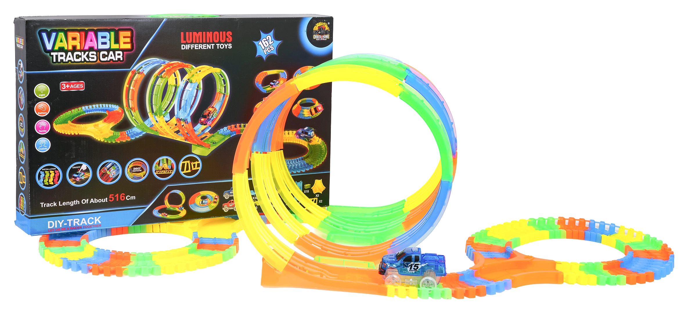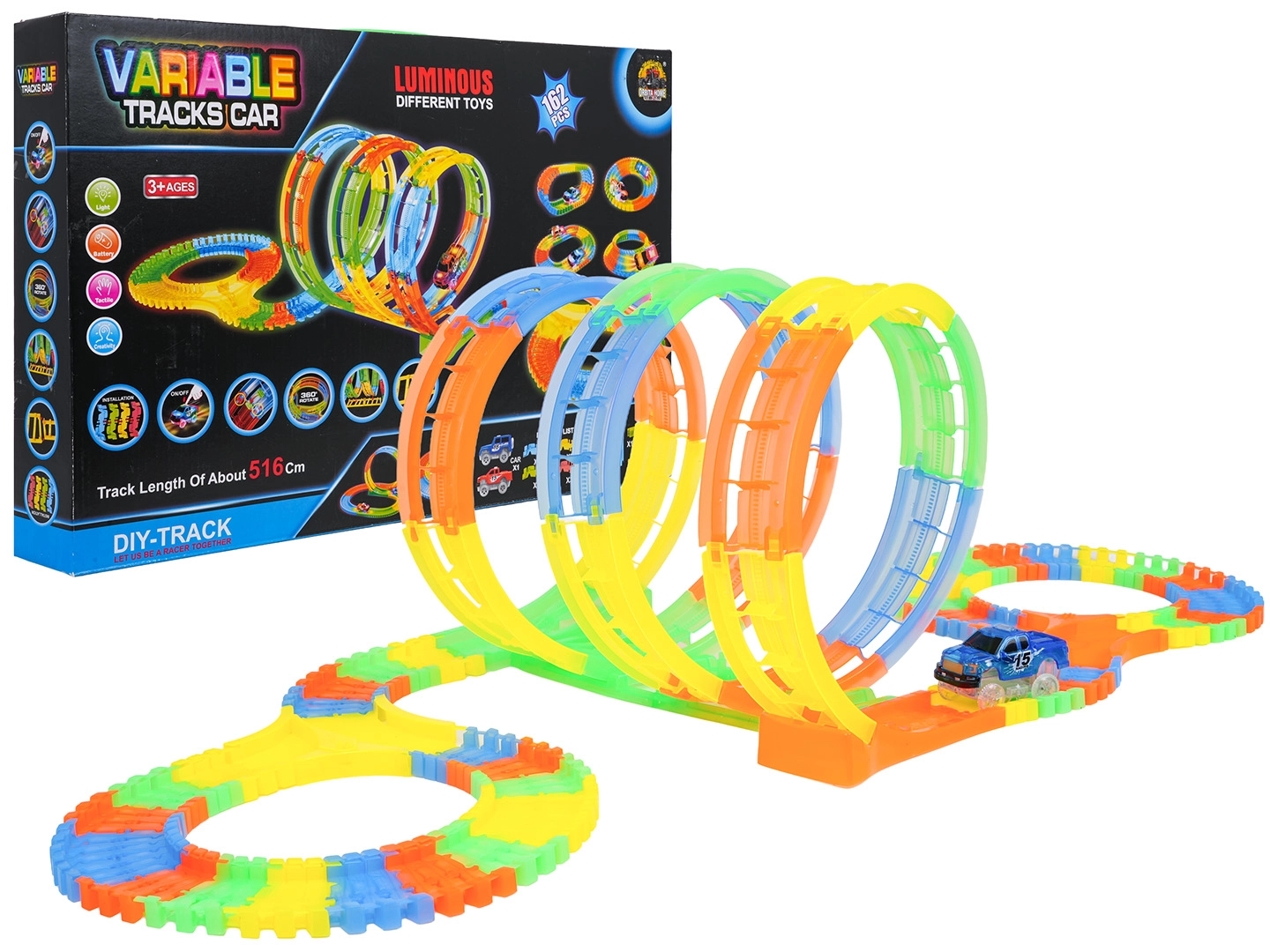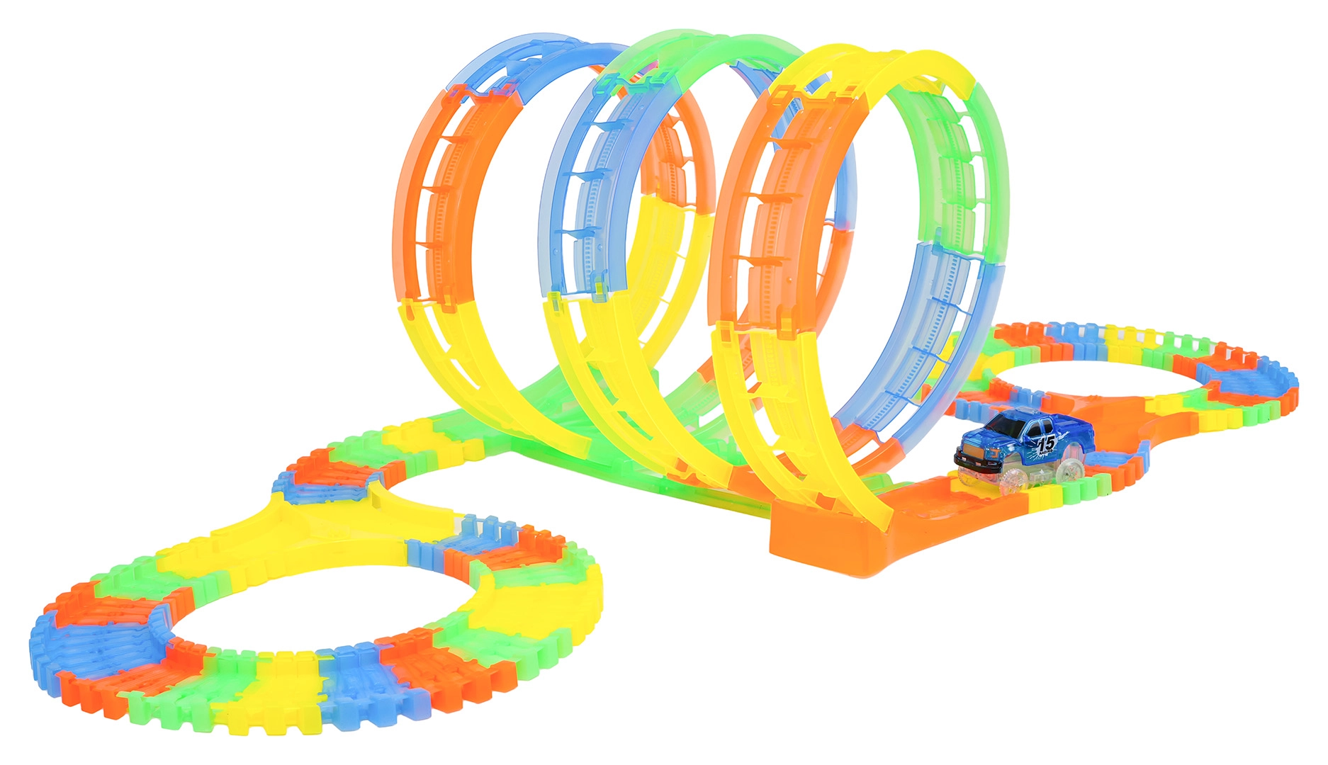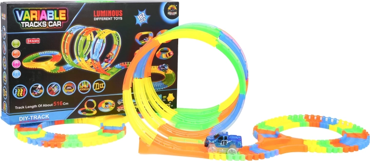 Тази цветна писта предлага на децата креативно строене и динамично каране. Благодарение на еластичните, щракващи елементи за миг се получават примки, завои и мостове, които могат да се преработват по всяко време – дори по време на каране. Флуоресцентното изпълнение на пистата и LED подсветката на количката създават впечатляващо светлинно шоу в тъмното.