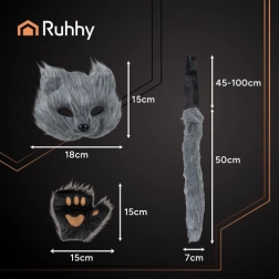 Изразете се докрай със стилния комплект RUHHY 4в1. Комбинацията от маска с ластик, дълга регулируема опашка с гъвкава тел и сладки лапи/ръкавици създава универсален костюм за косплей, конвенции, партита, видеа и тематични фотосесии. Мекото и приятно изкуствено кожухче е удобно за носене и изглежда реалистично.