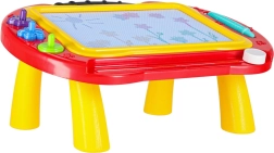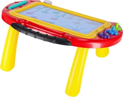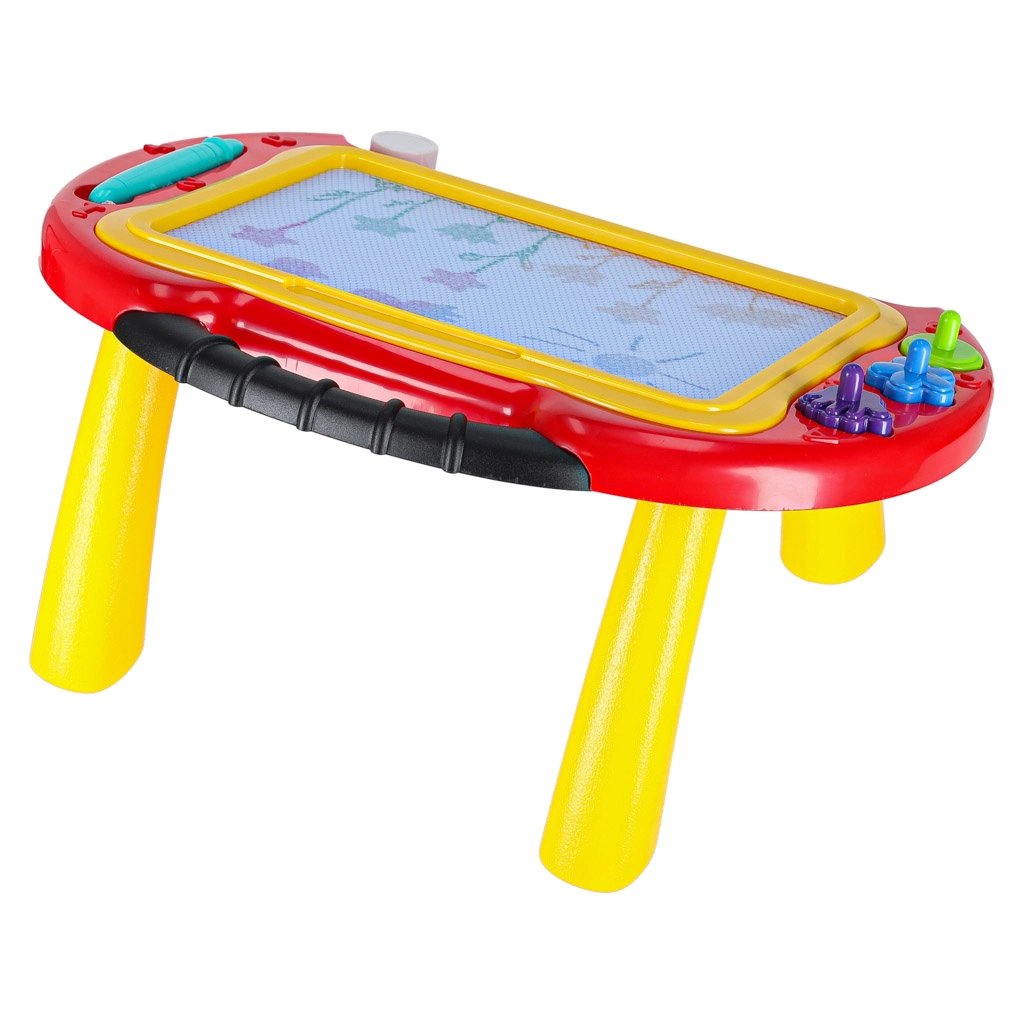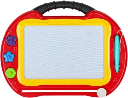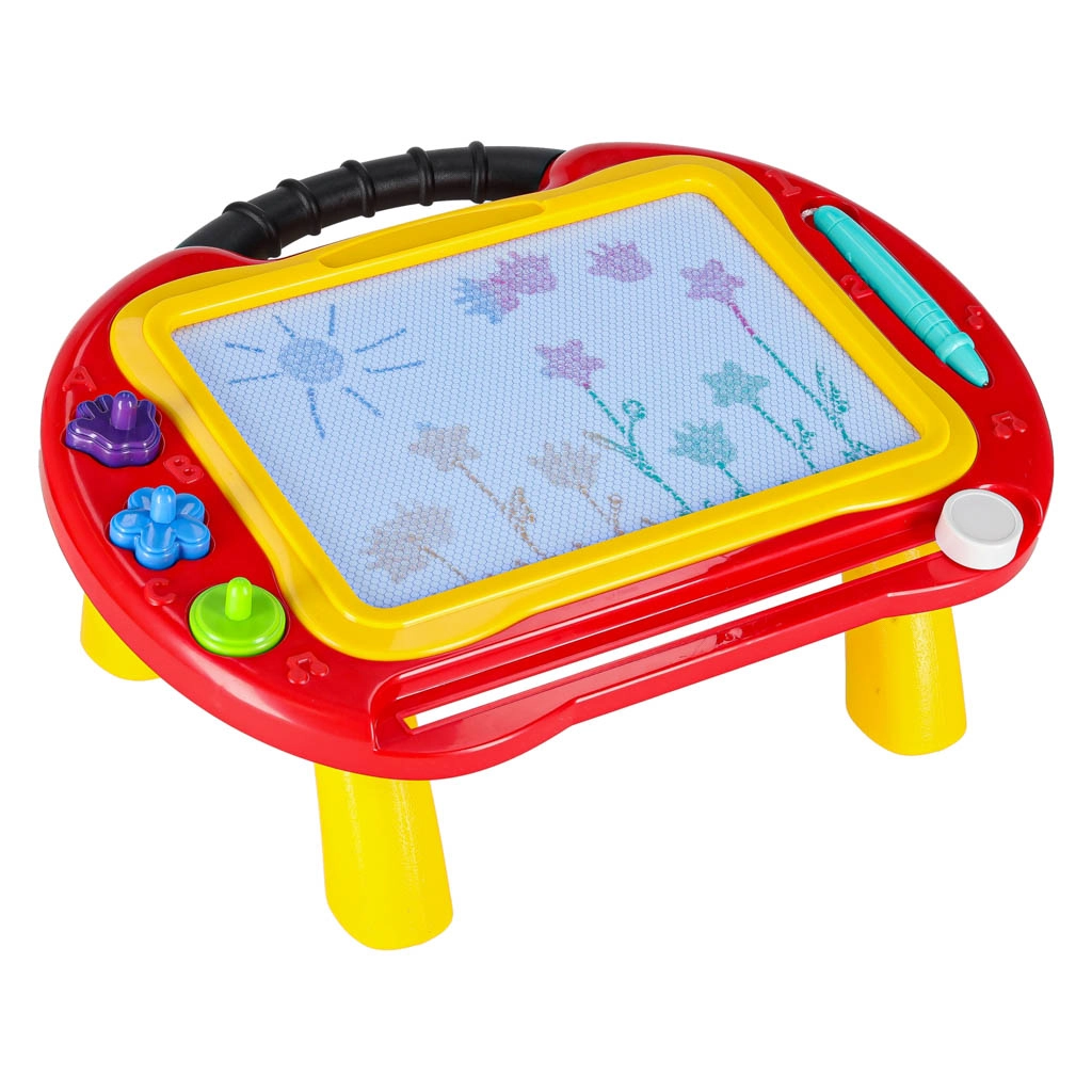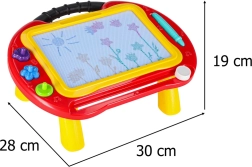 Подкрепете креативността и фината моторика на децата с универсалната магнитна дъска 2в1. Служи като стабилна масичка за удобно седене и като лека преносима дъска с дръжка. Децата могат да рисуват, да пишат първите букви и числа и да използват печати с интересни форми – всичко без хартия и без петна.