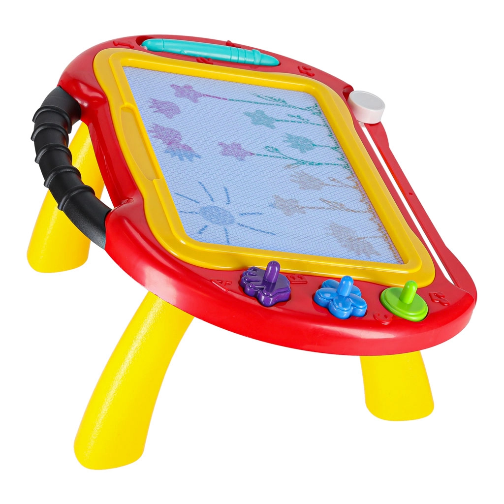 Екранът показва 4 цвята за живи изображения, които с едно движение на плъзгача за изтриване се почистват. Стилусът на връв не се губи, а свалящите се крачета позволяват игра навсякъде – в детската стая, хола и по време на пътуване.