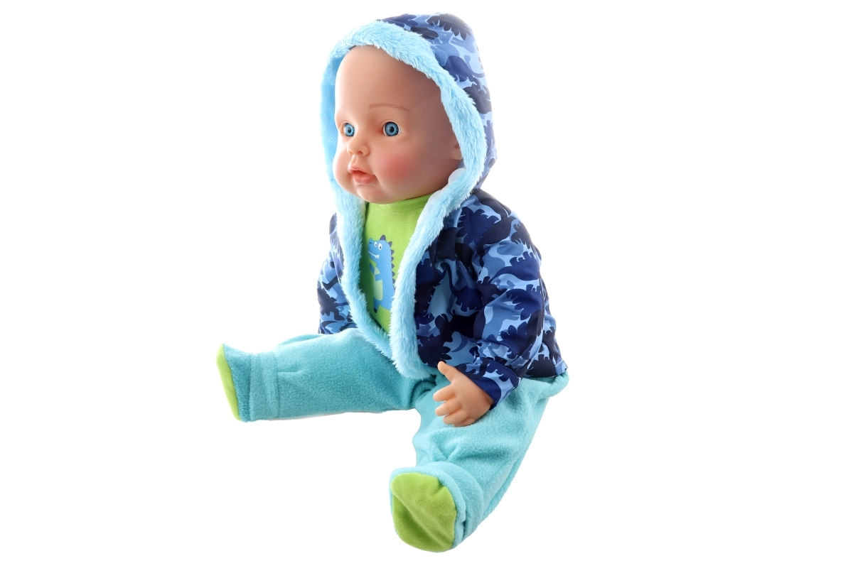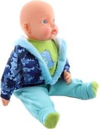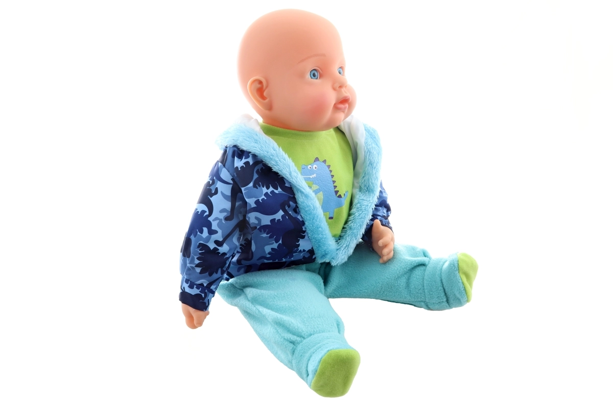 Тази голяма кукла бебе момче е чудесен спътник за ежедневни игри. Благодарение на мекото телце се държи и гушка приятно, докато реалистичната глава и краища на крайниците от пластмаса допринасят за автентична визия. Стилният комплект с динозавърски мотив се съблича и облича лесно – идеален за трениране на фината моторика и въображаеми игри.