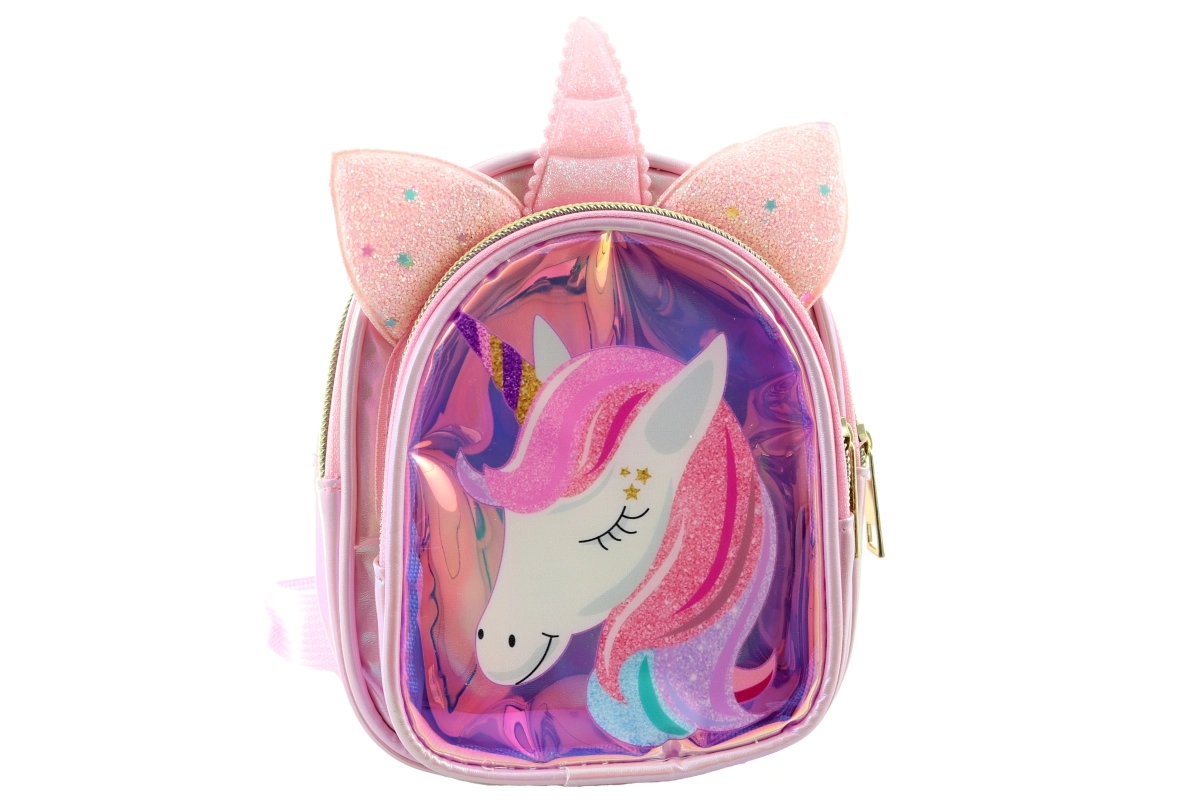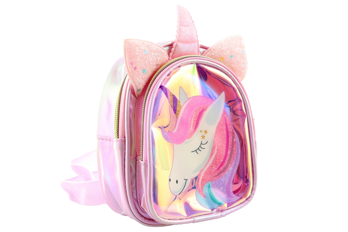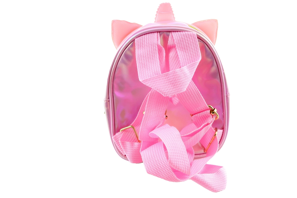 Иридисцентната, блестяща повърхност и сладките 3D детайли (уши и рог) правят раничката изключителен ежедневен аксесоар.