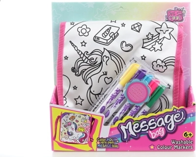 Открийте вълшебната чанта за оцветяване с мотив на еднорог, която ще предложи на децата часове творческо забавление. Благодарение на практичното закопчаване с велкро и розовата презрамка чантата се носи удобно и се отваря лесно. В комплекта ще намерите всичко необходимо – самата чанта и 5 цветни маркера, за да започнете да творите веднага.