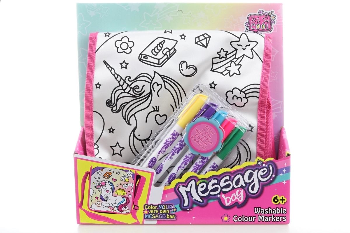 Креативна чанта за оцветяване с очарователен мотив на еднорог ще зарадва всяко малко творческо дете. В комплекта има регулируема розова презрамка и комплект от 5 цвята за незабавно оцветяване. Чантата има практично закопчаване с велкро и е идеална за дребни вещи и за път. Подкрепя креативността, лесна за използване и забава за деца 3+.