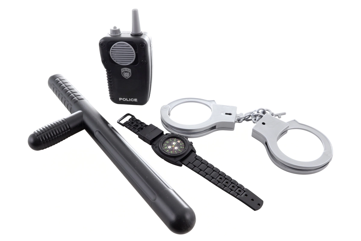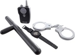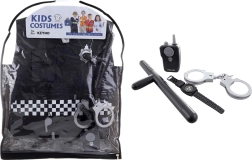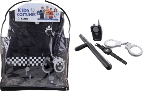 Станете герой на улицата с този полицейски костюм за деца. Комплектът включва жилетка, часовник, радиостанция, белезници и палка – всичко необходимо за реалистична полицейска игра. Изработен от издръжливи пластмаса и полиестер. Идеален за деца от 3 години.