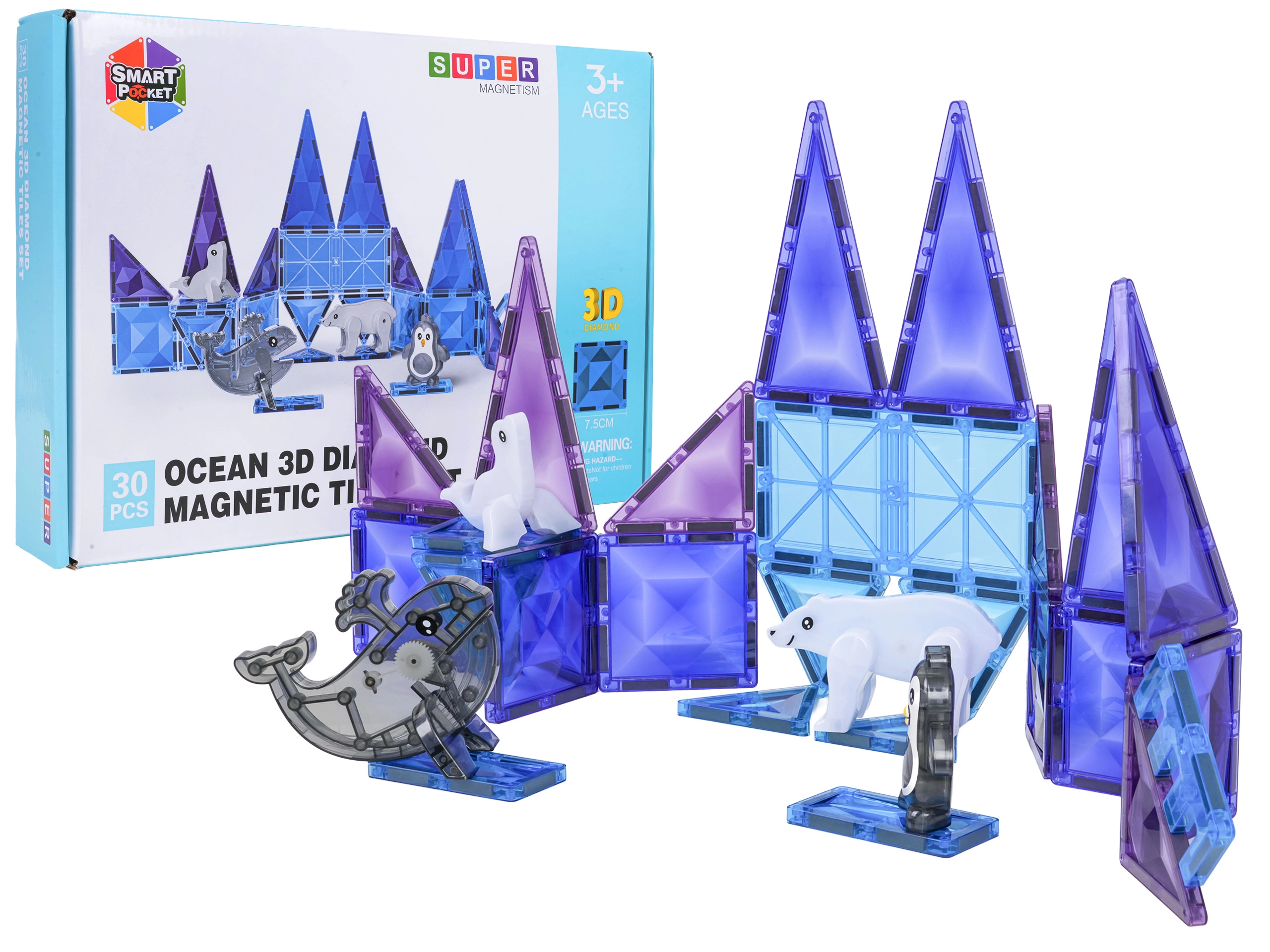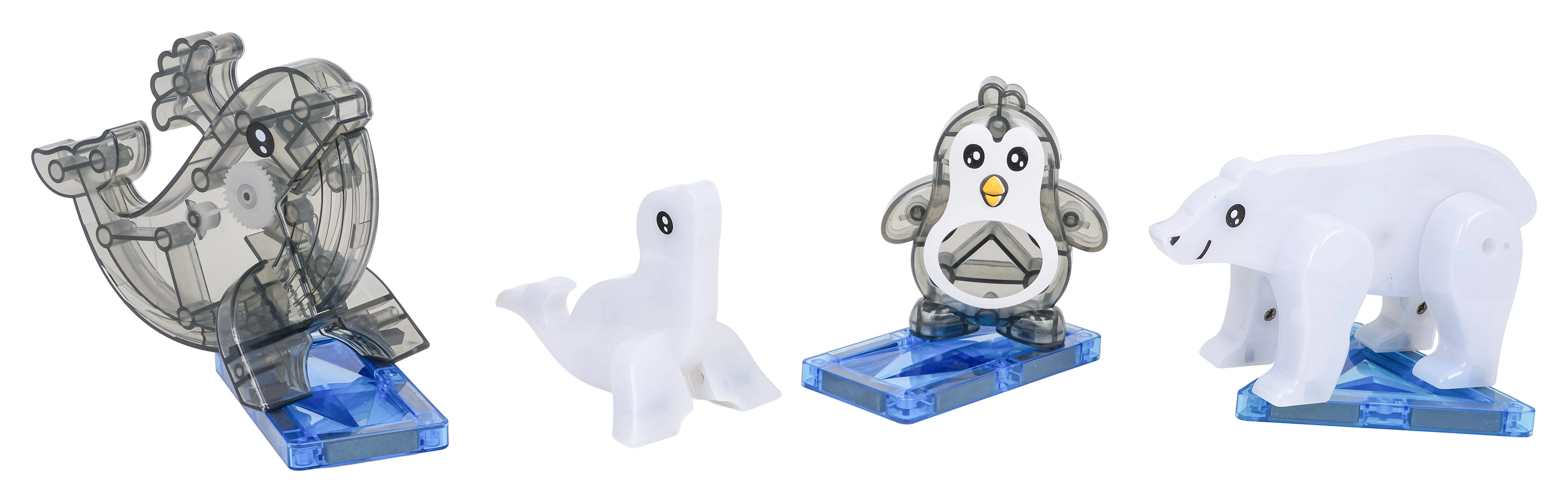 Фигурките имат подвижни елементи (делфинът отваря уста, мечката движи краката, пингвинът вдига и сваля перките), което подпомага фантазийните истории и фината моторика. Частите могат да се комбинират под различни ъгли и да се създават неограничени вариации – от прости форми до сложни 3D модели.