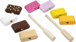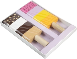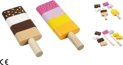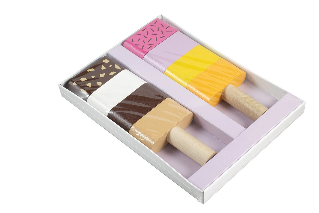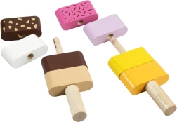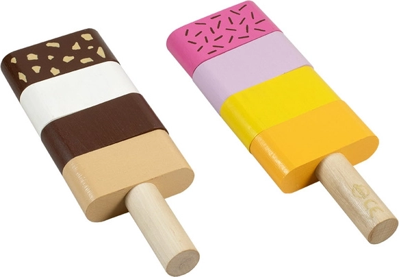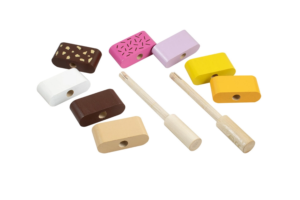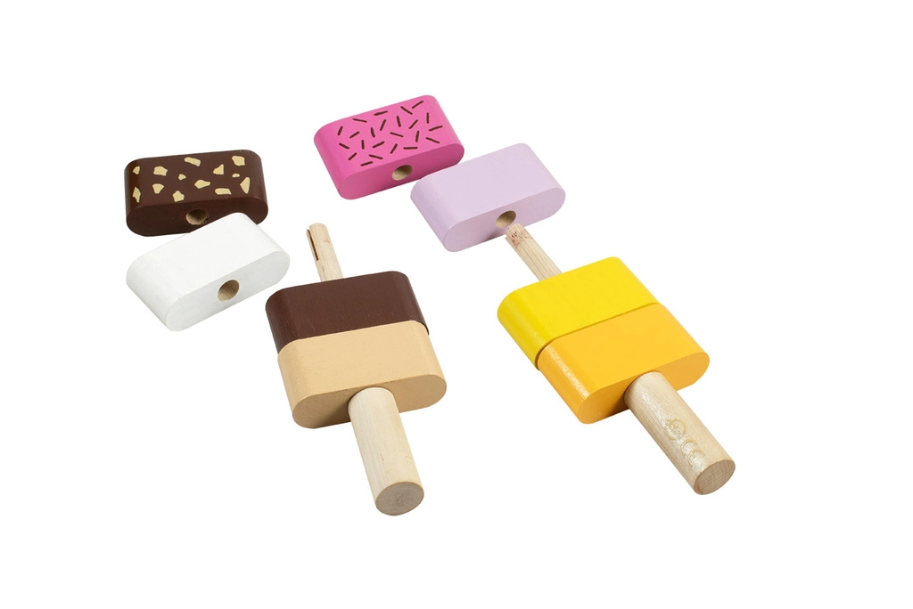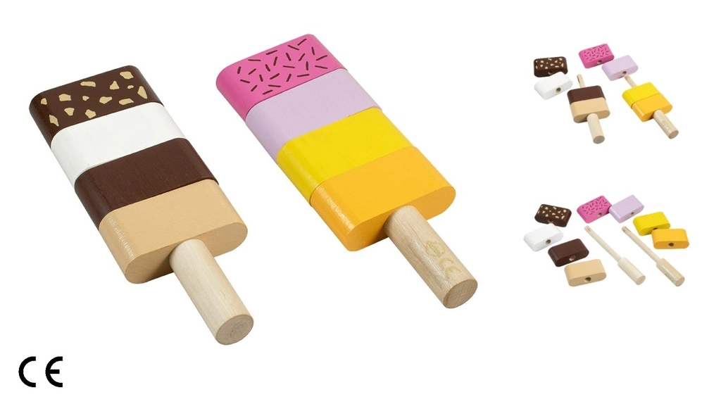 Забавна дървена моторна играчка за най-малките: два сглобяеми сладоледа със сменяеми елементи, които подпомагат фината моторика, въображението и логическото мислене. Децата могат свободно да комбинират цветовете и да подреждат „вкусовете“ според фантазията си. Качествената изработка от дърво и безопасните бои отговарят на европейските стандарти за безопасност.