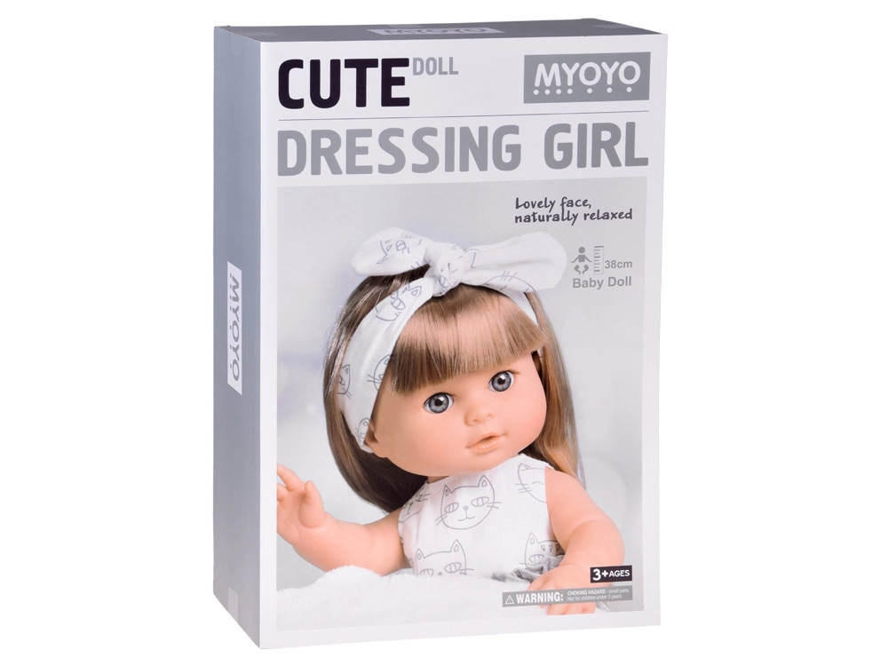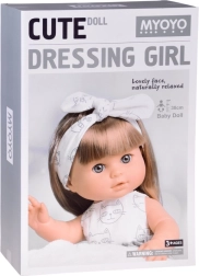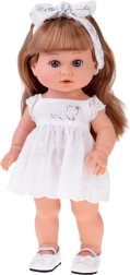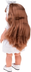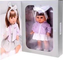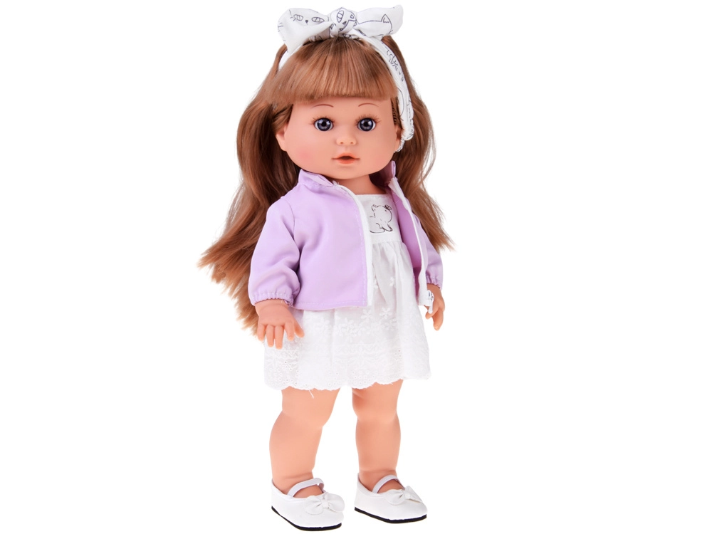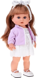 Открийте сладката кукла с дълга коса и височина 38 см, която ще зарадва малките фризьори и почитателите на модата. Тя има реалистични черти, дълга кестенява коса за разресване, подвижни крайници и носи бяла дантелена рокличка с лилаво яке. В комплекта е включена четка за коса за безкрайни прически и креативна игра.