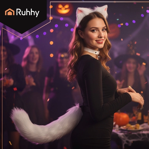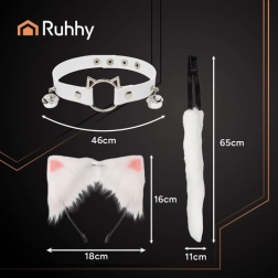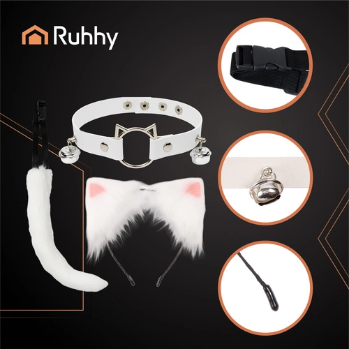 Стилен 3‑частен комплект RUHHY в бял цвят, който мигновено преобразява всеки аутфит. Включва мека опашка с оформяща жичка, диадема с уши и регулируем чокър с звънчета. Идеален за косплей, фотосесии, партита и TikTok – лек, удобен и готов за незабавно носене. Комплект 3в1, приятна изкуствена кожена текстура, регулируем чокър и опашка и универсален размер за различни фигури.