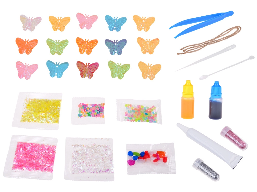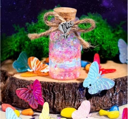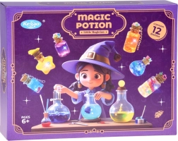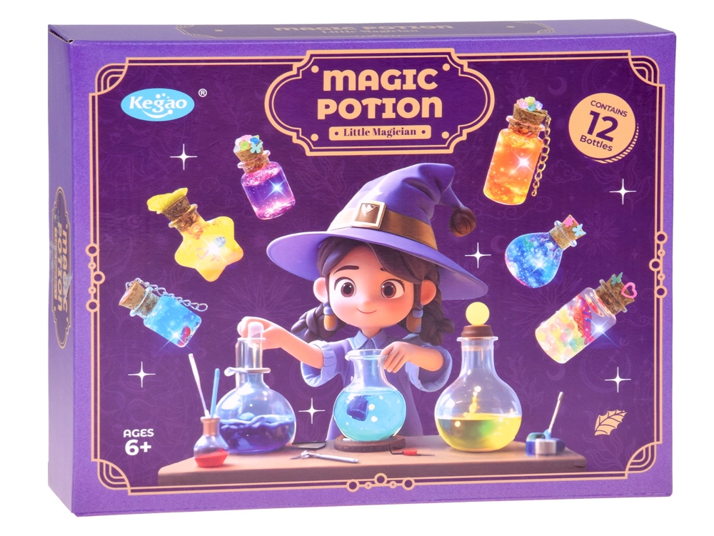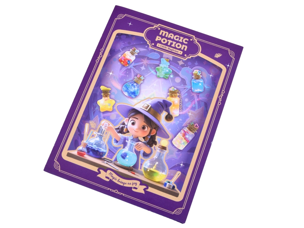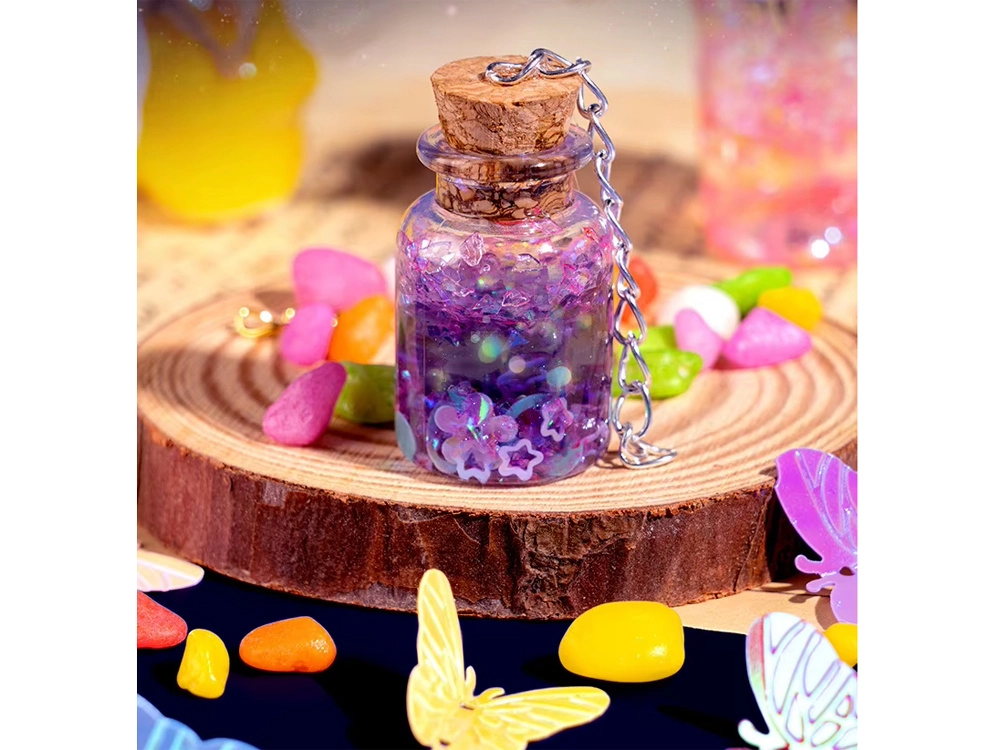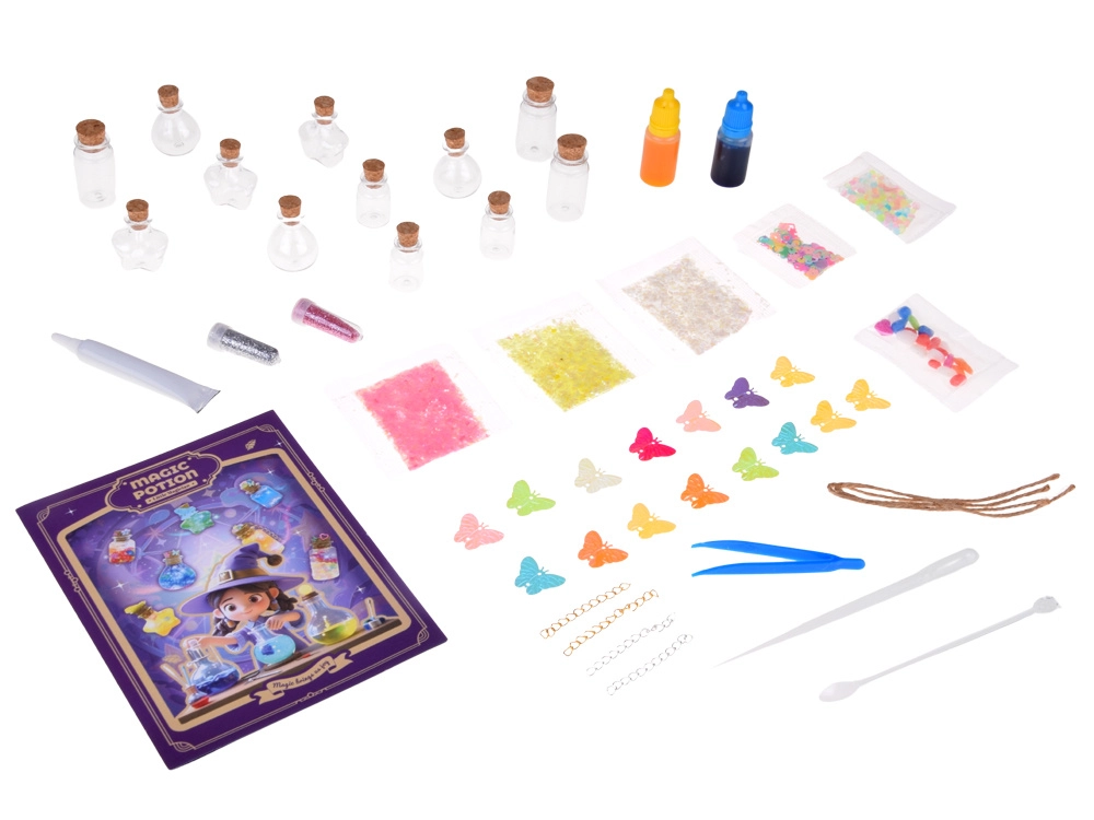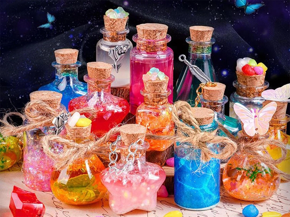 Комплектът за изработка на „вълшебни отвари“ превръща всяка идея в блестящо мини произведение. Достатъчно е да насипете блясъци и украси в шишенцето, да добавите вода с пигмент, да затворите с коркова тапа и да доукрасите с висулки. Резултатът може да е висулка, талисман или сладка декорация за детската стая.