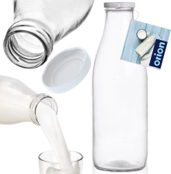 Практична стъклена бутилка с обем 1 литър с метална винтова капачка за безопасно съхранение и сервиране на напитки. Благодарение на прозрачното стъкло, здравата изработка и надеждното затваряне е идеална за мляко, сокове, лимонади и коктейли. Подходяща за хладилник, почиства се лесно и поддържа напитките свежи по-дълго.