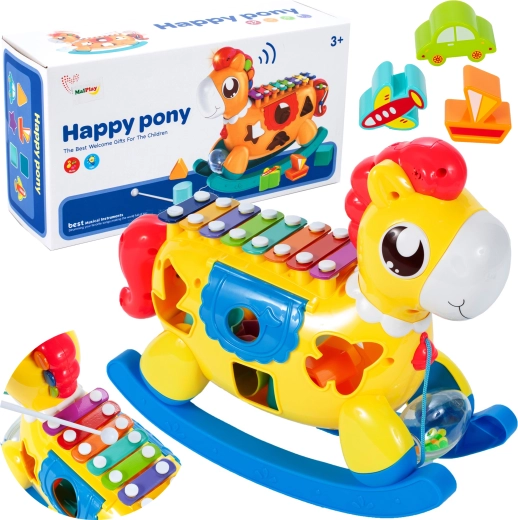 Забавна играчка 3 в 1 за най-малките: люлеещо се конче, сортер за форми и мини чинели. При завъртане на опашката със скритите мъниста се чува приятно дрънкане, което подпомага слуховото възприятие. Отличен избор за деца от 3 години за развитие на моториката, координацията и креативността.