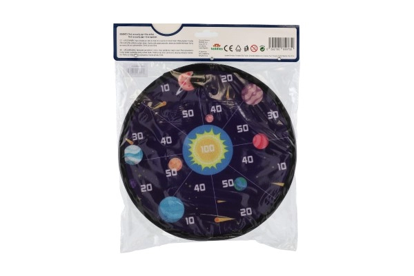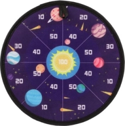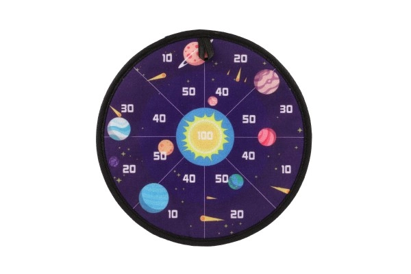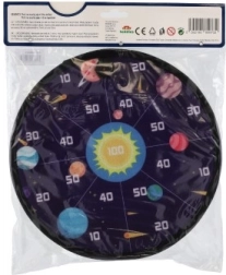 Едната страна на мишената е проектирана с привлекателни цветове и числа за традиционна игра, докато другата страна предлага космическа тематика с изображения на планети. Децата имат възможност да упражняват математика, като събират точките, постигнати с отделните хвърляния.