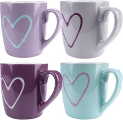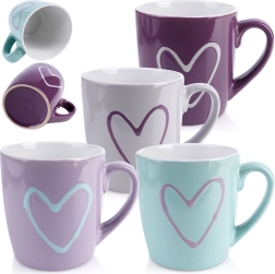 Стилен комплект от четири керамични чаши с обем 350 мл в различни цветове с мотив сърце. Те са декорирани, издръжливи и универсални за кафе, чай и други напитки. Благодарение на удобната дръжка се държат добре, могат да се мият в съдомиялна и да се използват в микровълнова фурна. Доказано качество на марката ORION.