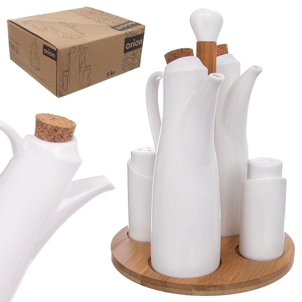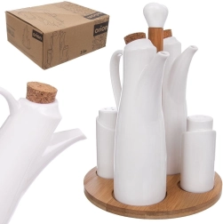Елегантен порцеланов комплект за маса с въртяща се бамбукова поставка, който държи подправките и овкусителите ви подредени и под ръка. Съдържа бутилки за олио и оцет, солница и пиперница. Порцелановите съдове са издръжливи и лесни за почистване, бамбуковата поставка осигурява стабилност и стил, корковите тапи запазват свежестта на олиото и оцета, а практичните размери подхождат на всяка маса.