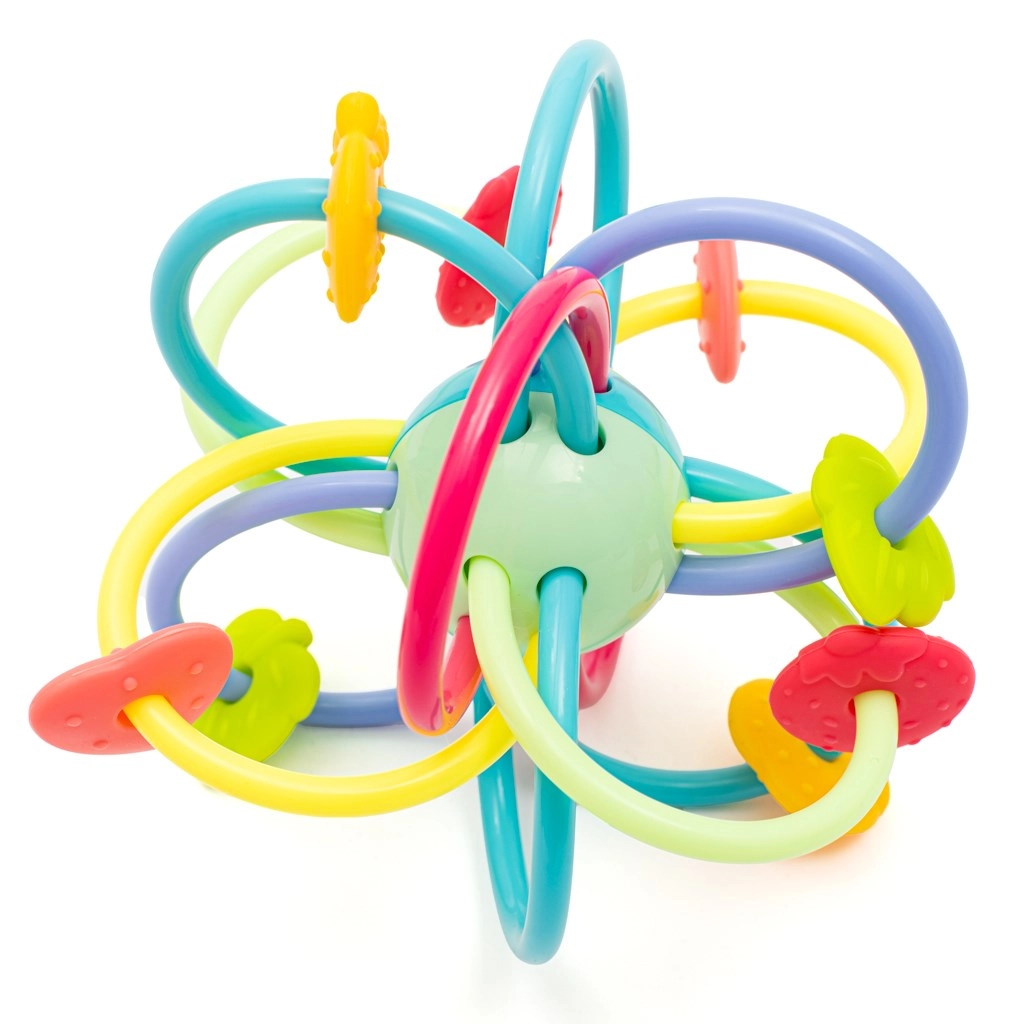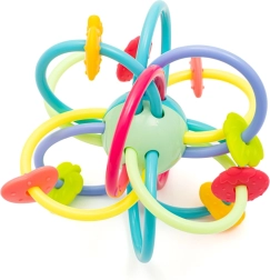 Леко и безопасно гризалo с дрънкалка за най-малките помага при пробиване на зъбки, подпомага сетивното развитие и тренира фината моторика. Комбинацията от силикон и висококачествен пластмасов материал без BPA е щадяща към венците и се поддържа лесно – може да се изварява при 100 °C за перфектна хигиена. Ергономичната форма и цветните текстури приканват към хващане, разклащане и изследване.